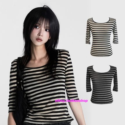 eihey诶嘿2025秋季修身条纹撞色T恤五分中袖微透绝美短袖上衣女