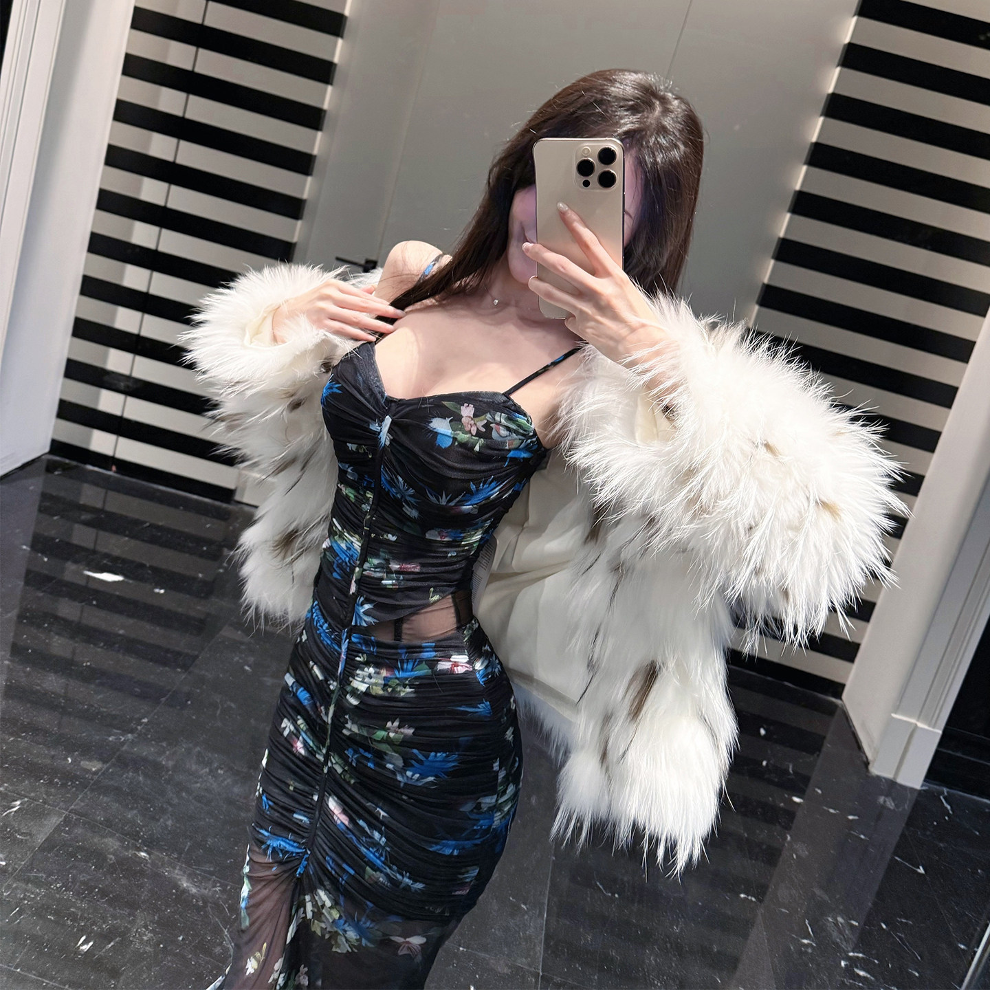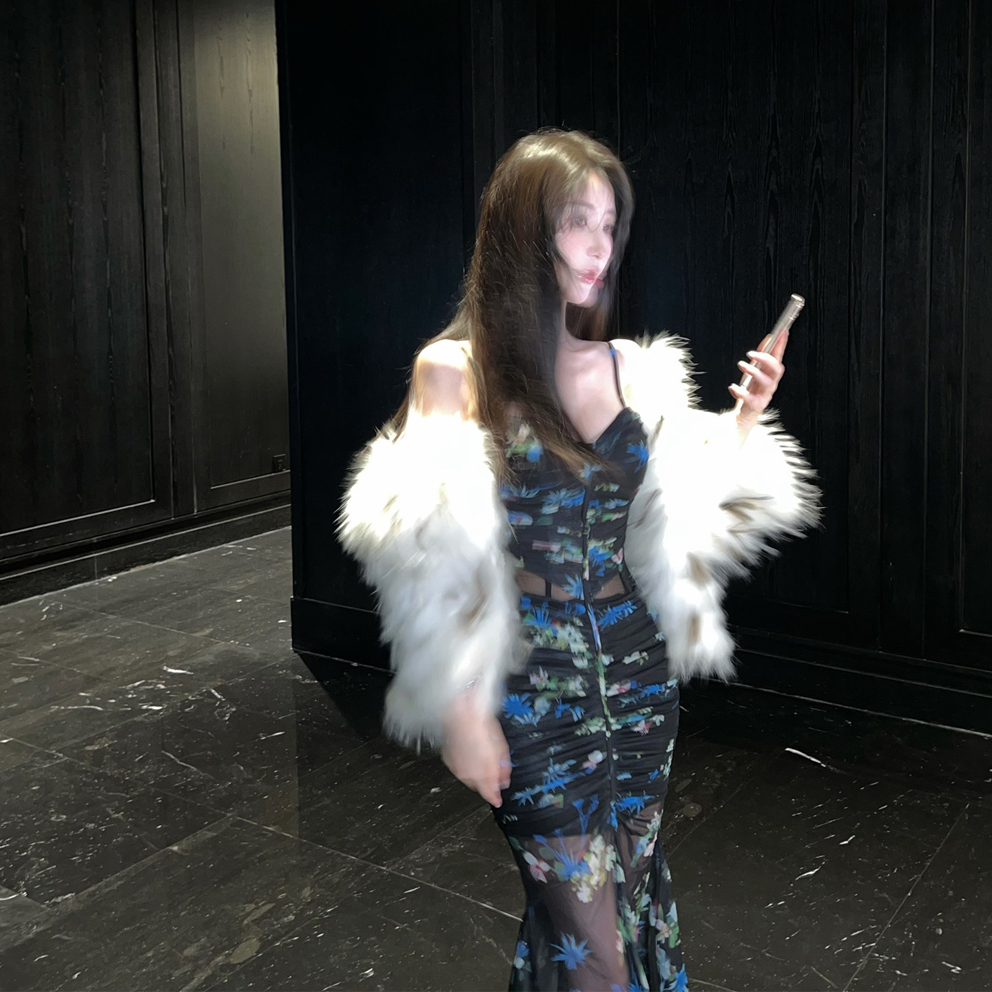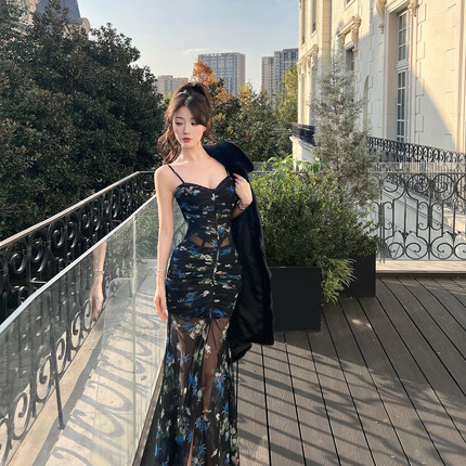 熊熊屋【蝶恋花】神秘性感黑底繁花修身透视包臀鱼尾连衣裙