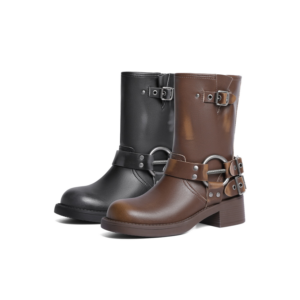 百丽机车靴加绒中筒女靴子美拉德骑士靴冬新款鞋子西部靴Z9U2DDZ3