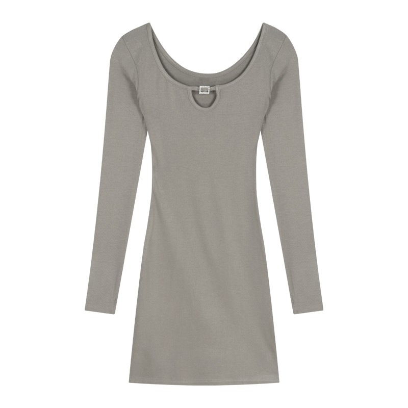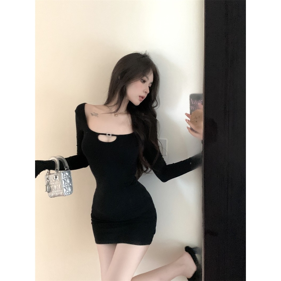 方领镂空连衣裙女秋冬季修身内搭裙长袖打底裙子性感紧身包臀短裙