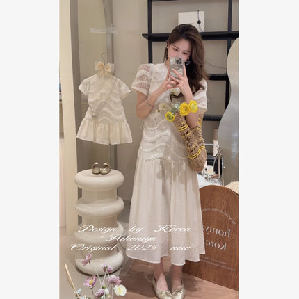 Spring韩国童装2025春夏新款亲子法式白色气质连衣裙女童休闲长裙