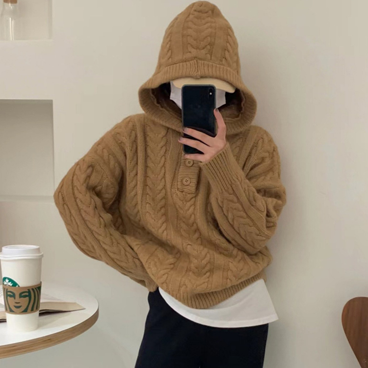 连帽慵懒风宽松单排扣针织衫