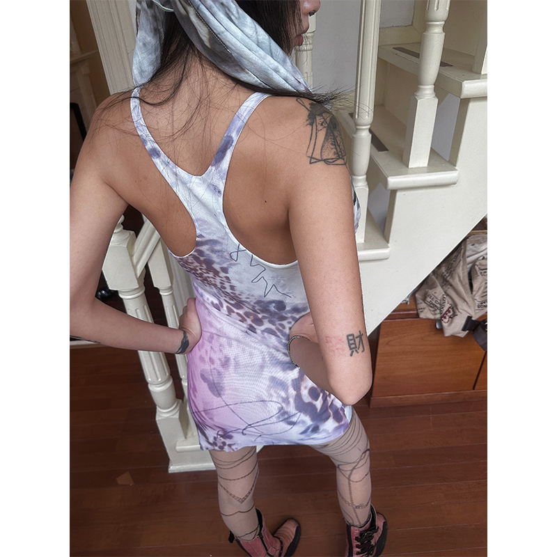 QSC原创设计粉色豹纹高弹双层网纱工字背心连衣裙打底收腰显瘦