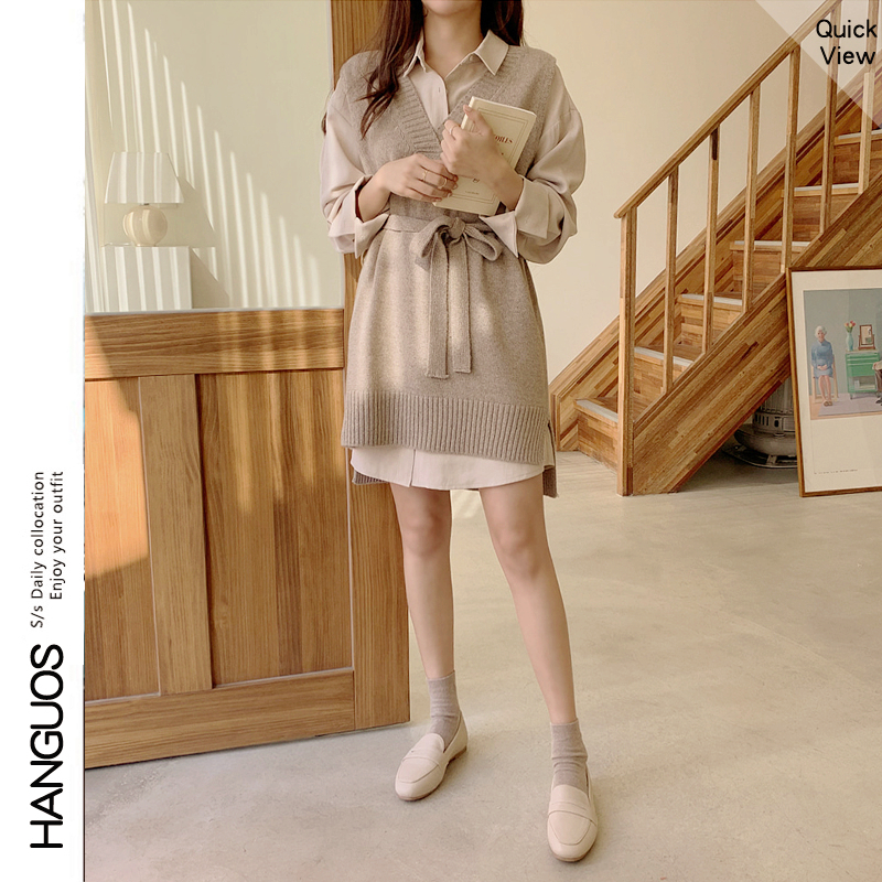 茶歇法式炸街连衣裙子女轻熟风气质矮个子衬衫针织裙两件套ins风