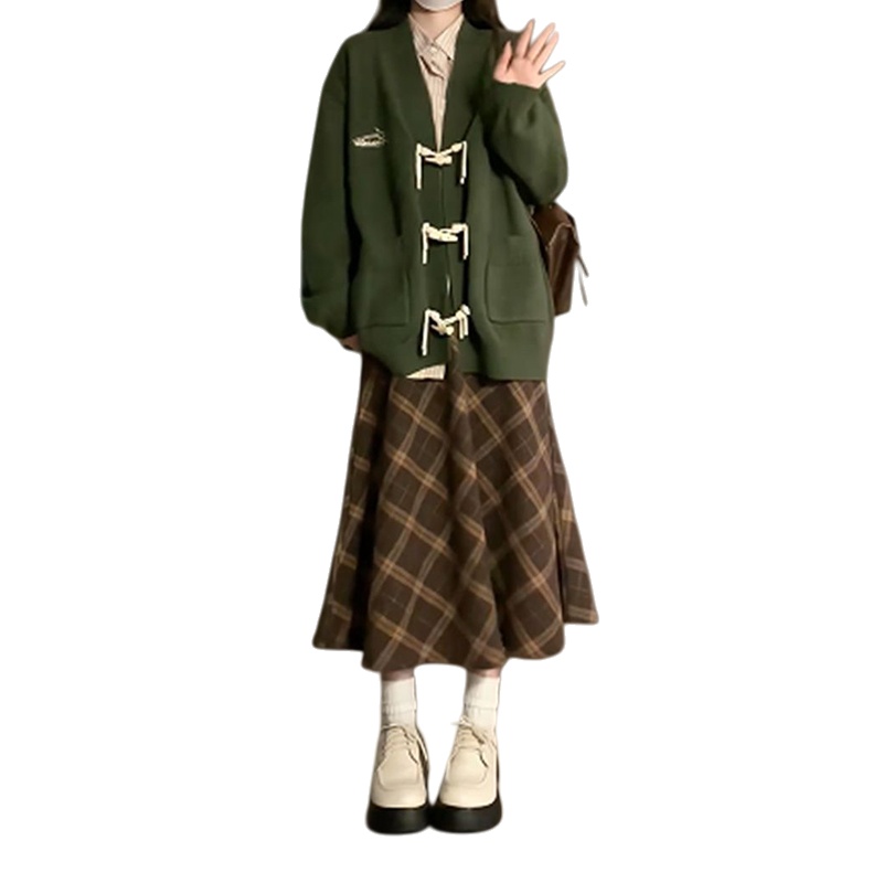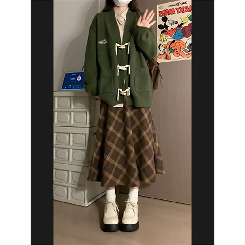 2025秋冬穿搭一整套艺术风条纹衬衫针织毛衣开衫外套女格纹半身裙