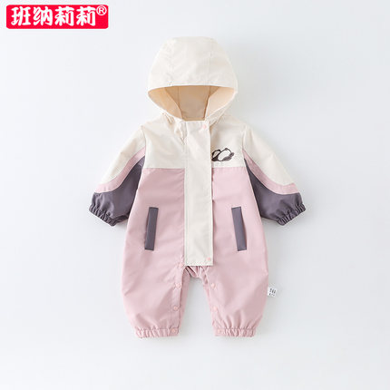 婴儿秋装女宝宝春秋冲锋衣2025新款连体哈衣外出百天爬服连帽外套