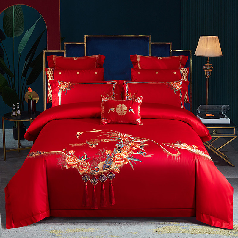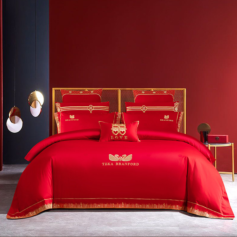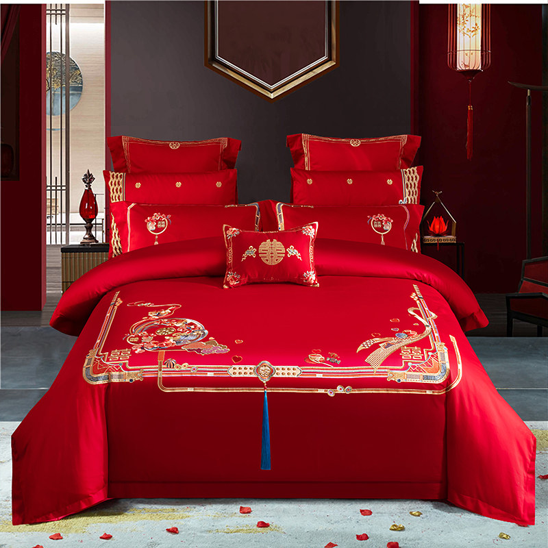 140支现代结婚庆被套床上四件套大红色绣花新婚房铺盖床单4件床品