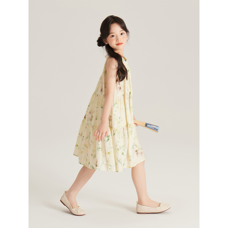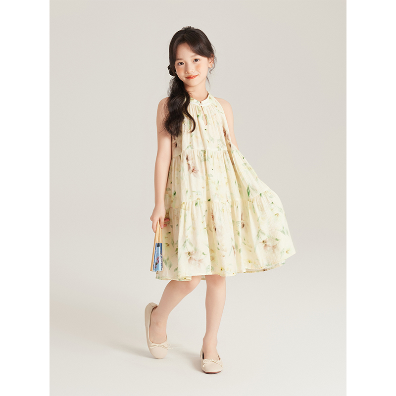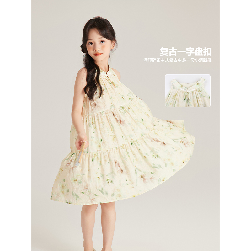 Amybaby女童连衣裙夏季2025新款度假风挂脖碎花吊带裙背心裙
