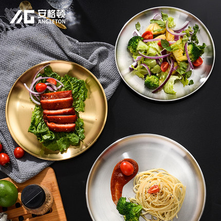 304不锈钢金色圆盘蛋糕盘水果盘菜盘骨碟盘双层西餐盘韩式烤肉盘