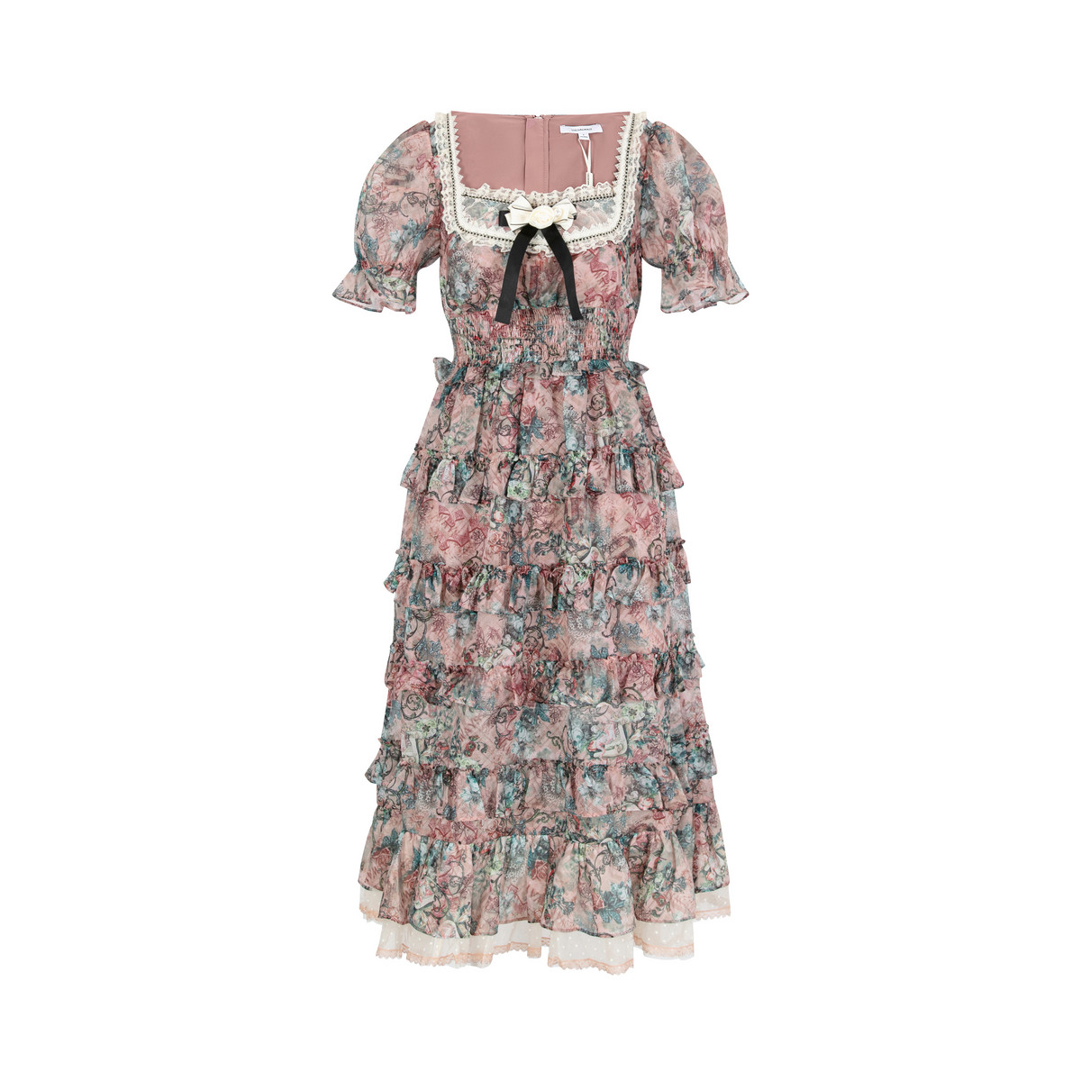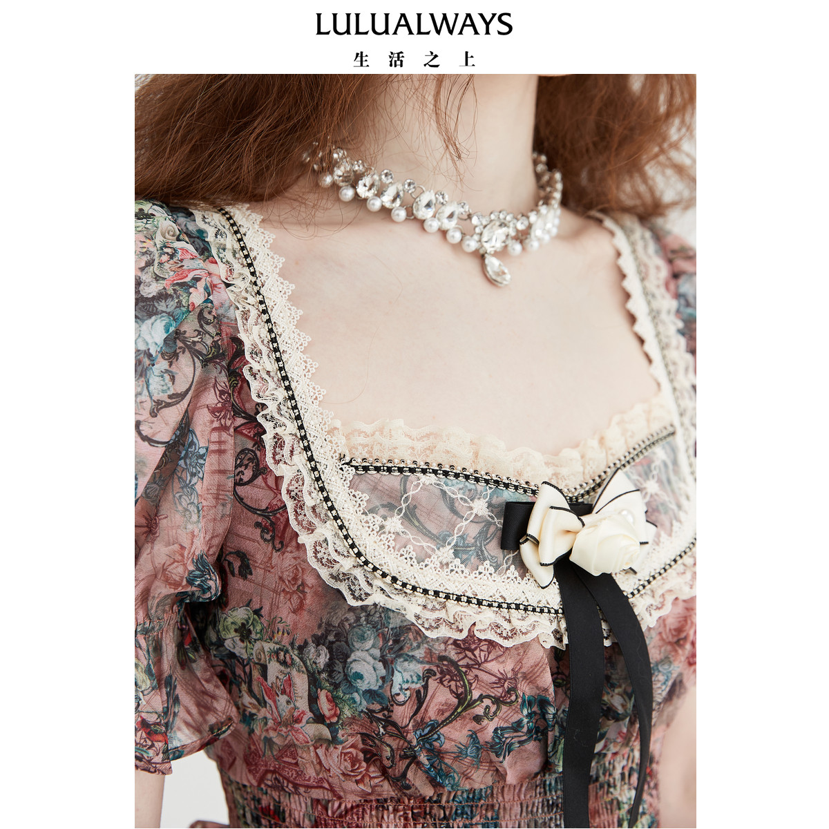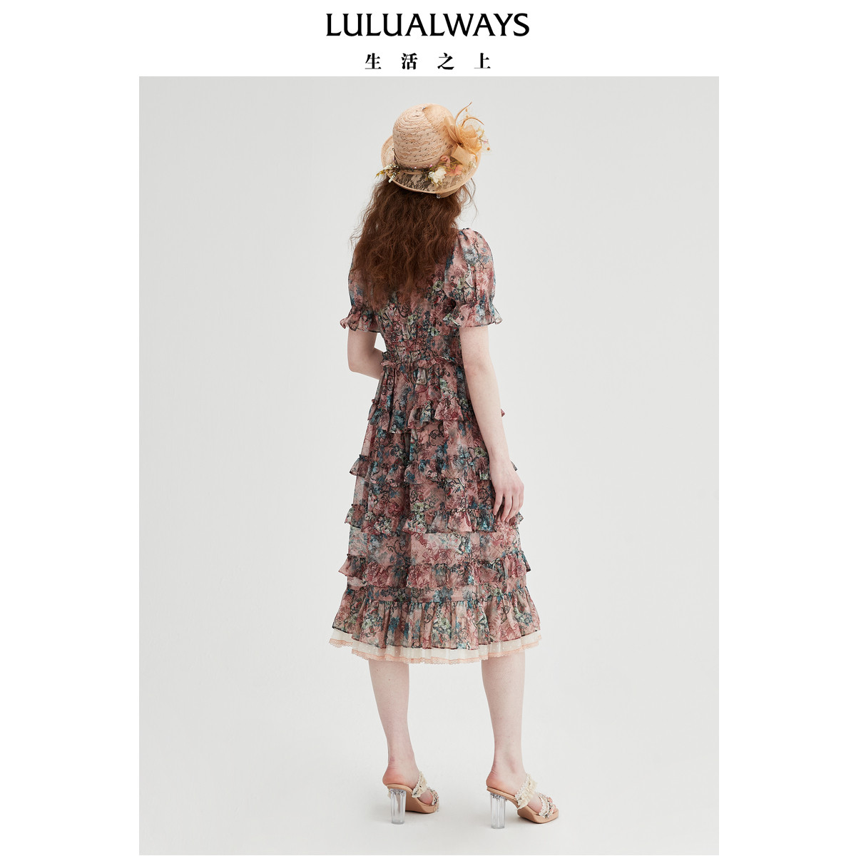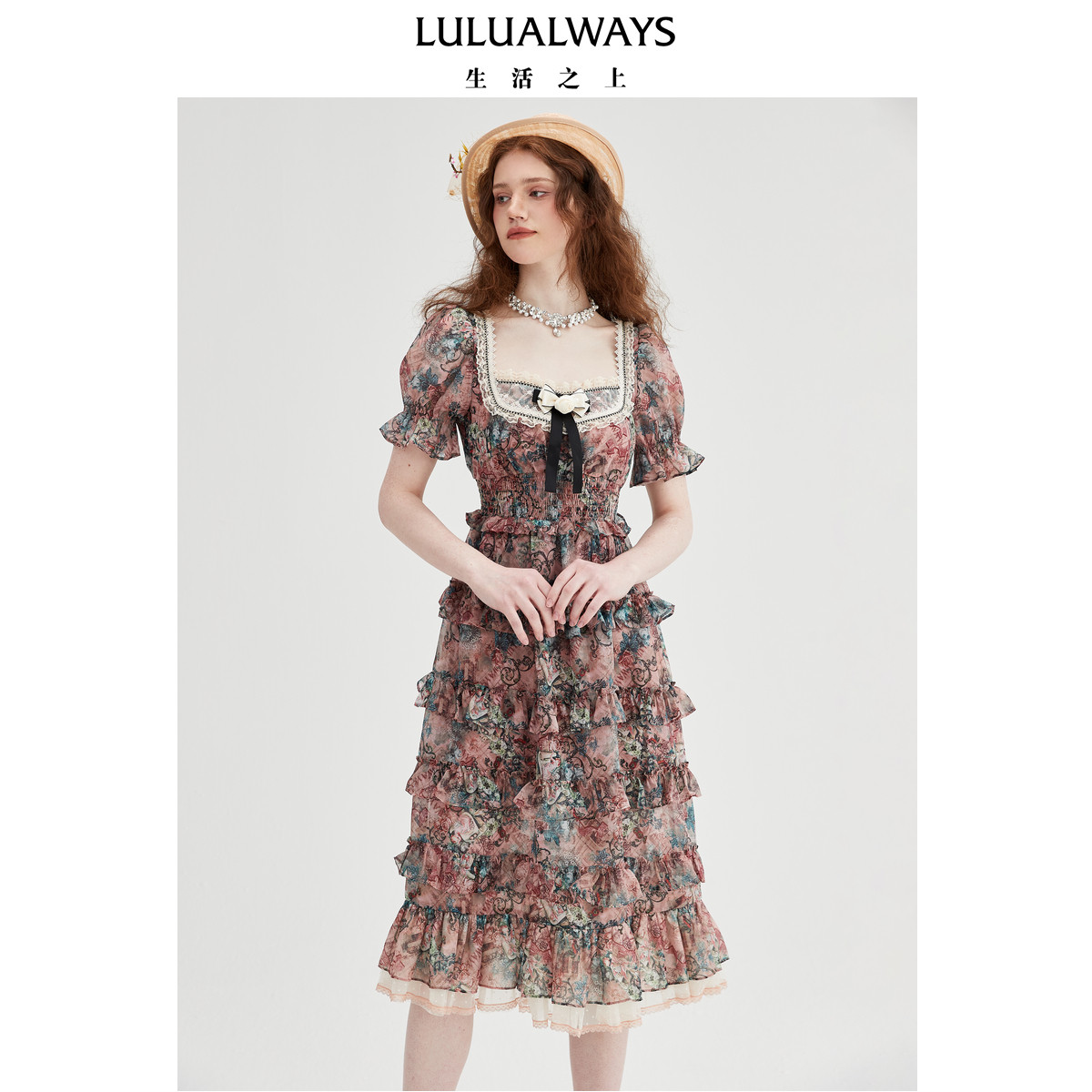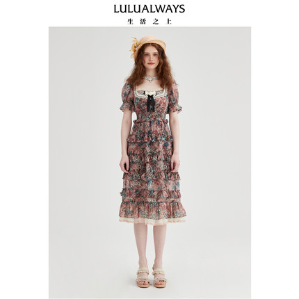 LULUALWAYS【商场同款】25夏季新款甜美网纱蝴蝶结印花蛋糕连衣裙