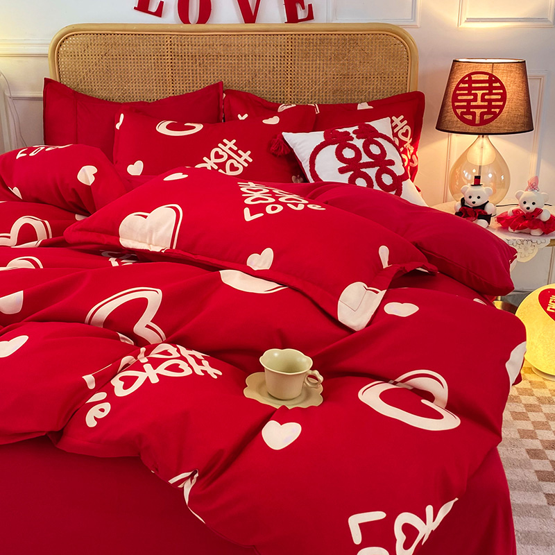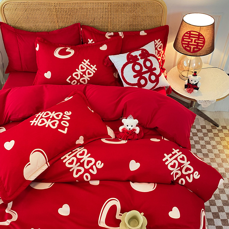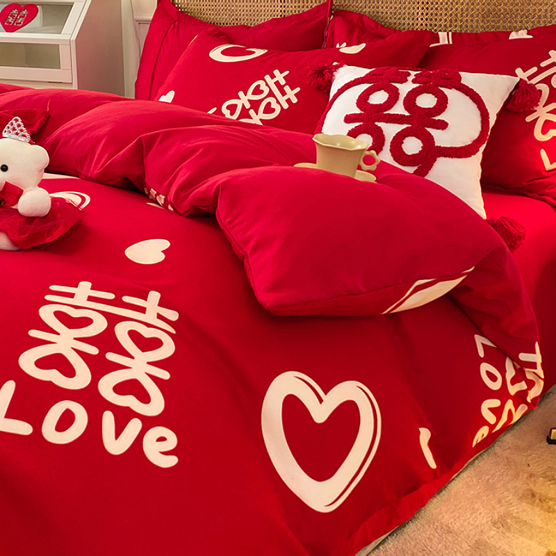 婚庆喜被床上四件套大红色结婚床单被套婚嫁新婚房磨毛非全棉纯棉