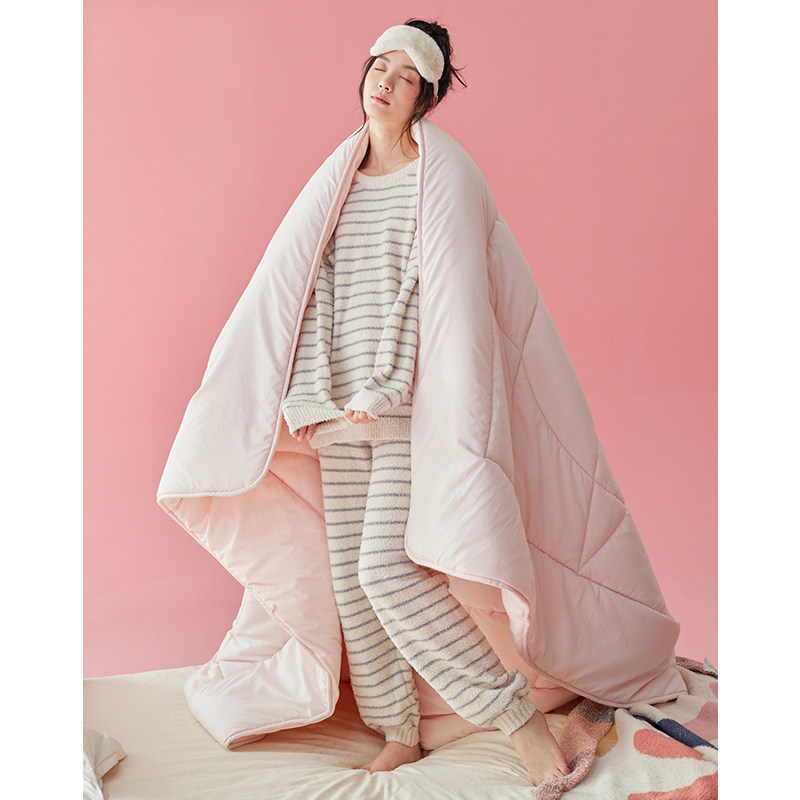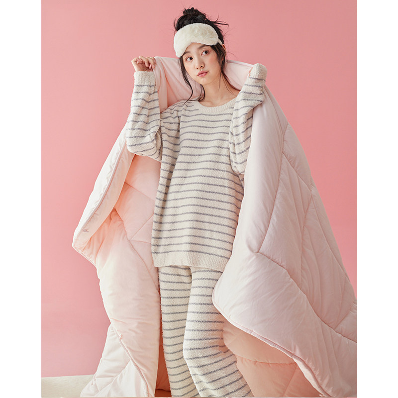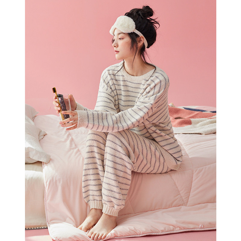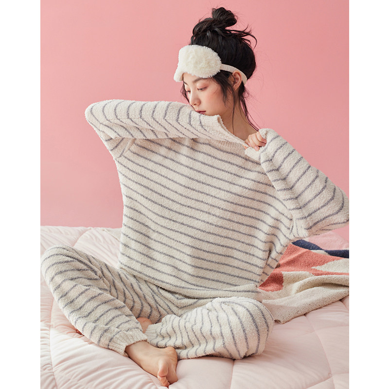 半边绒睡衣女秋冬季加厚保暖休闲套头可外穿家居服珊瑚绒条纹套装