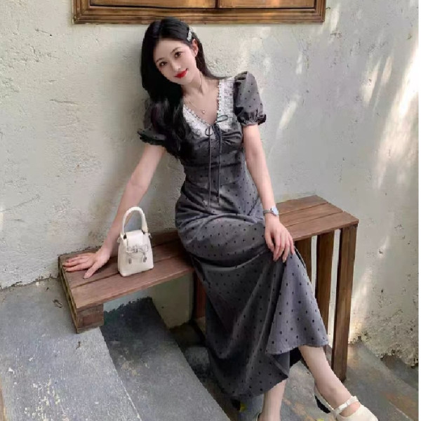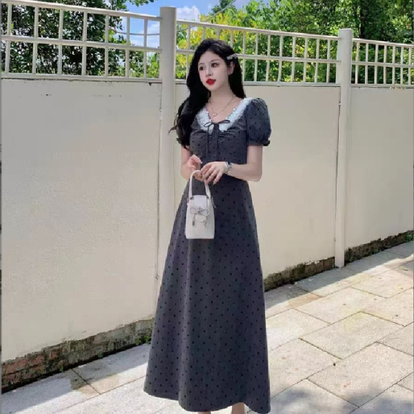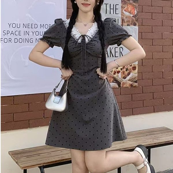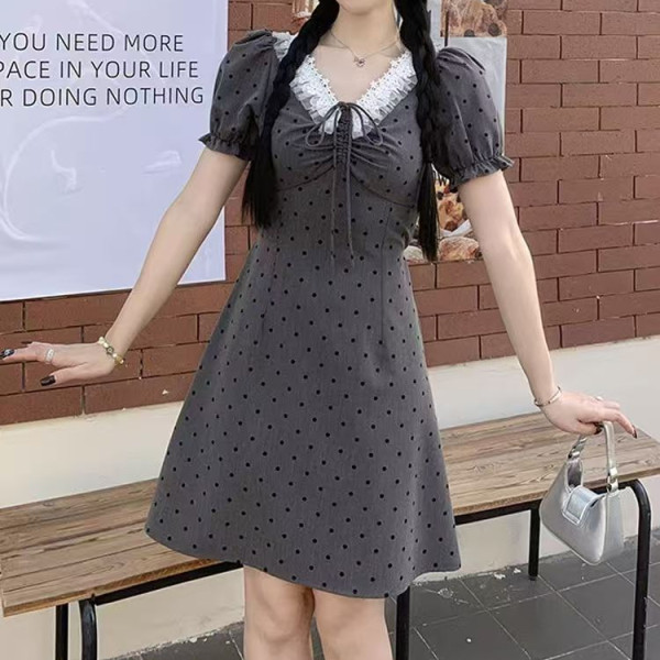 大码法式灰色波点连衣裙女夏季胖mm收腰显瘦遮肚子V领短袖长裙子