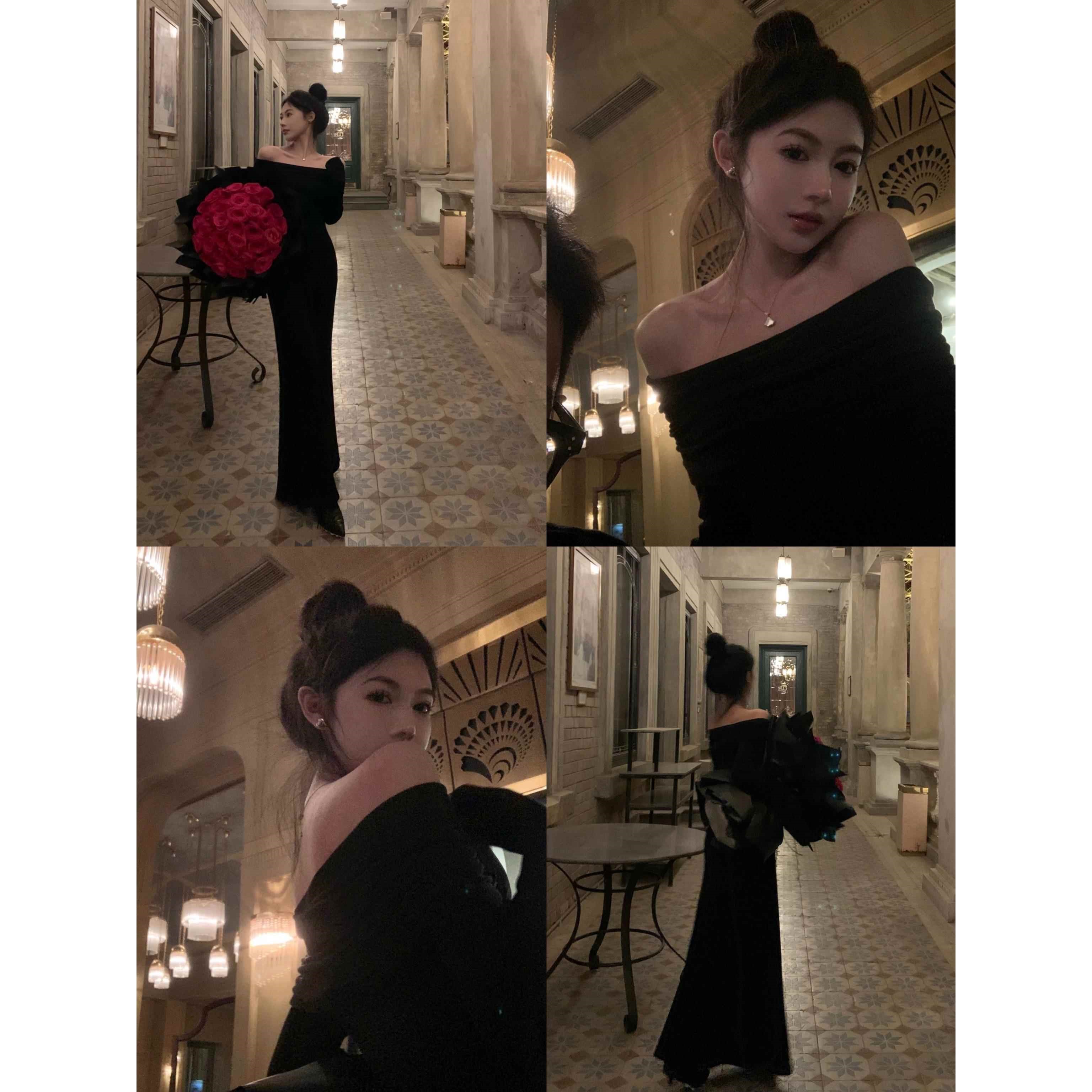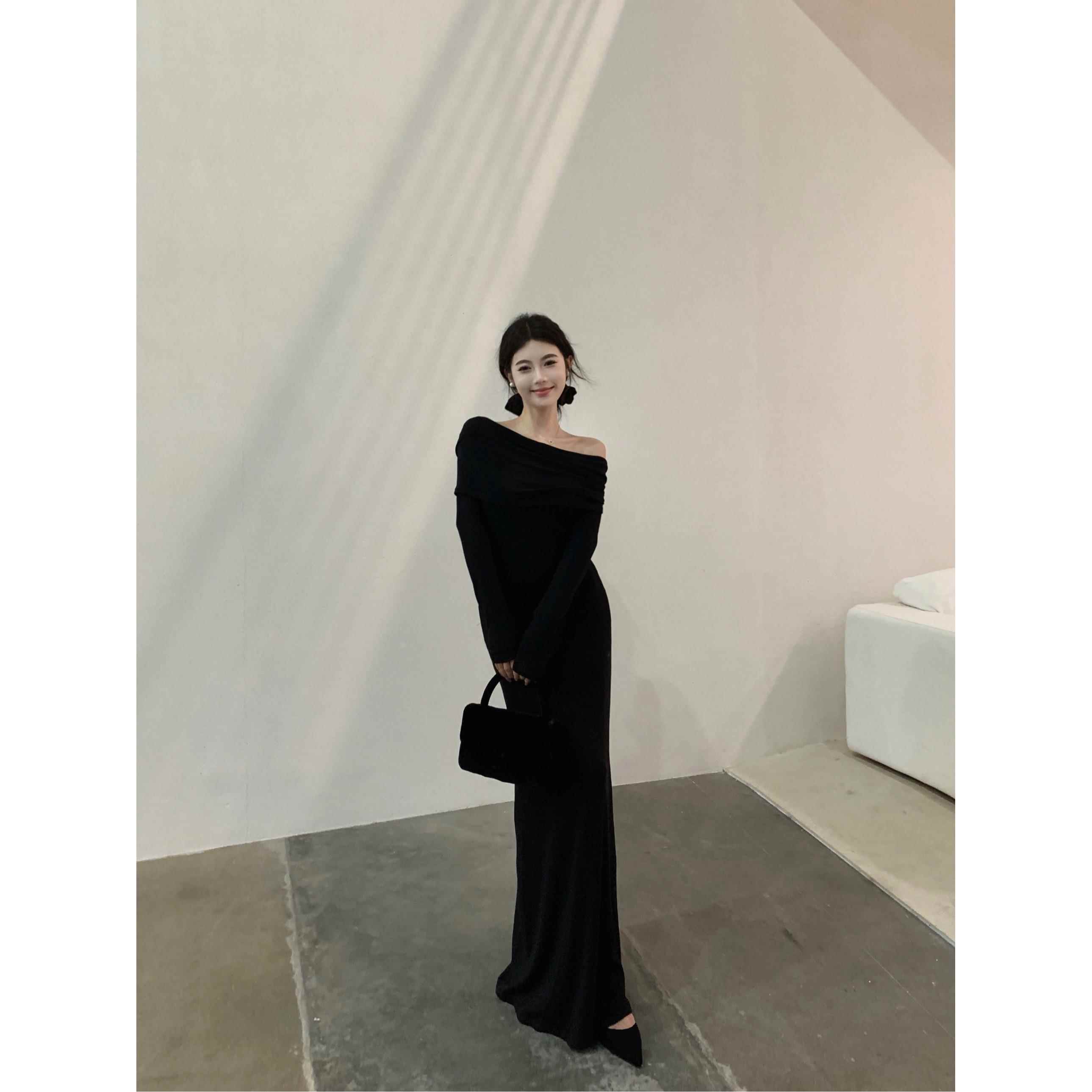 一字肩黑色长袖连衣裙女装冬季磨毛修身长裙性感收腰紧身包臀裙子