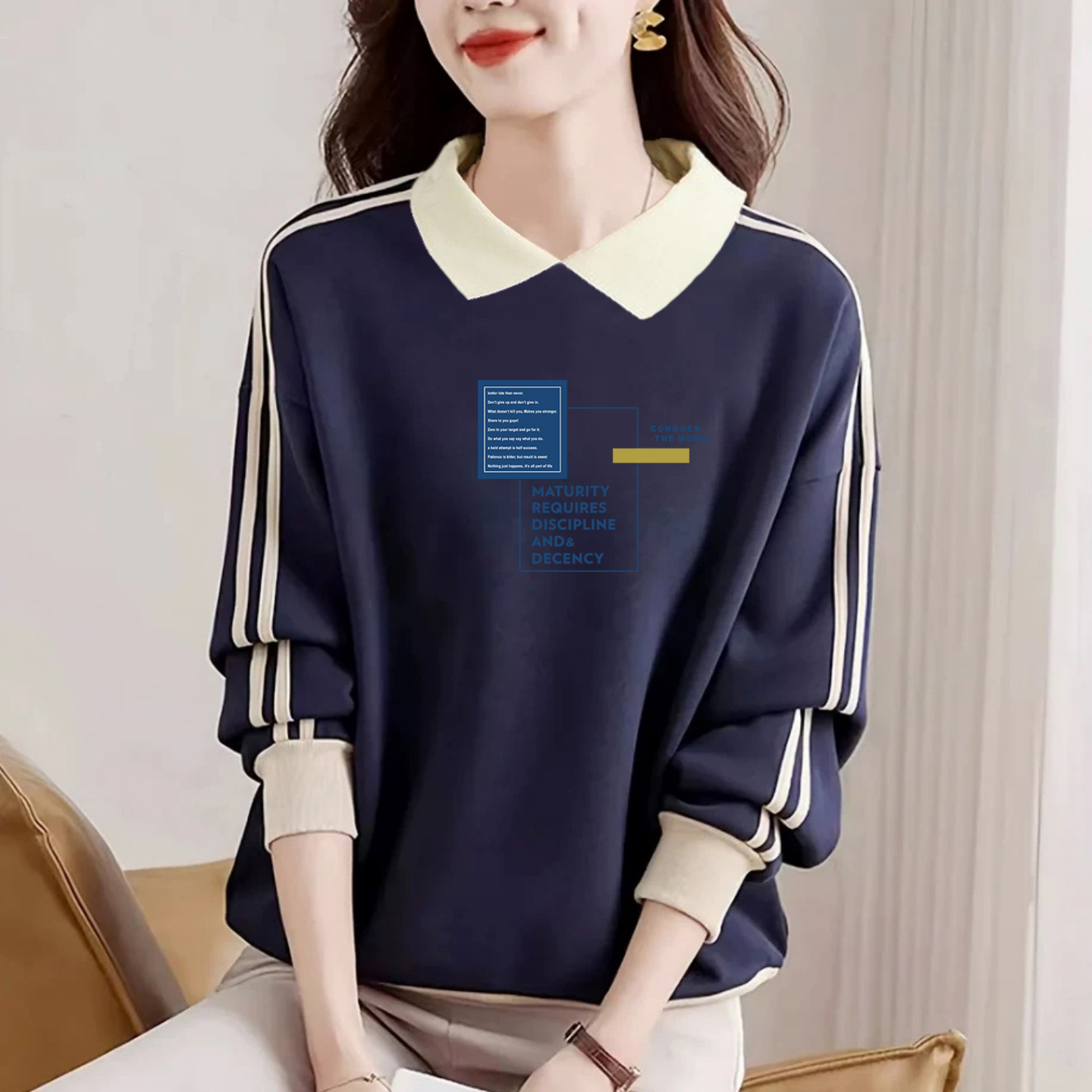 外贸原单女装纯棉长袖卫衣女秋冬季娃娃领打底衫时尚翻领印花上衣