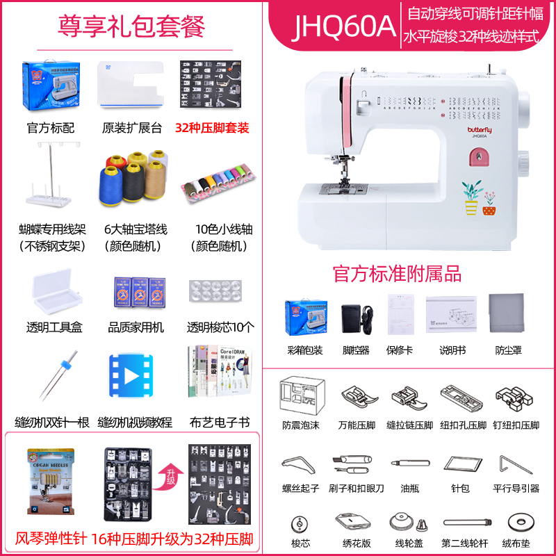 蝴蝶牌新款电动家用缝纫机JHQ60A水平旋梭多功能锁边吃厚缝32线迹