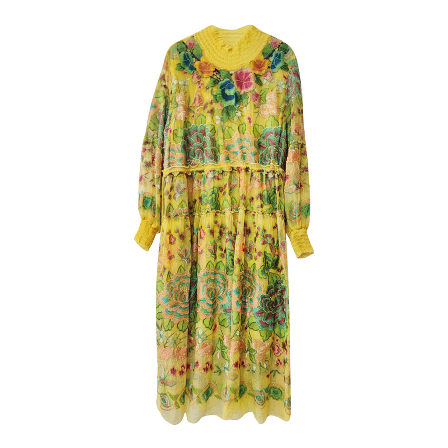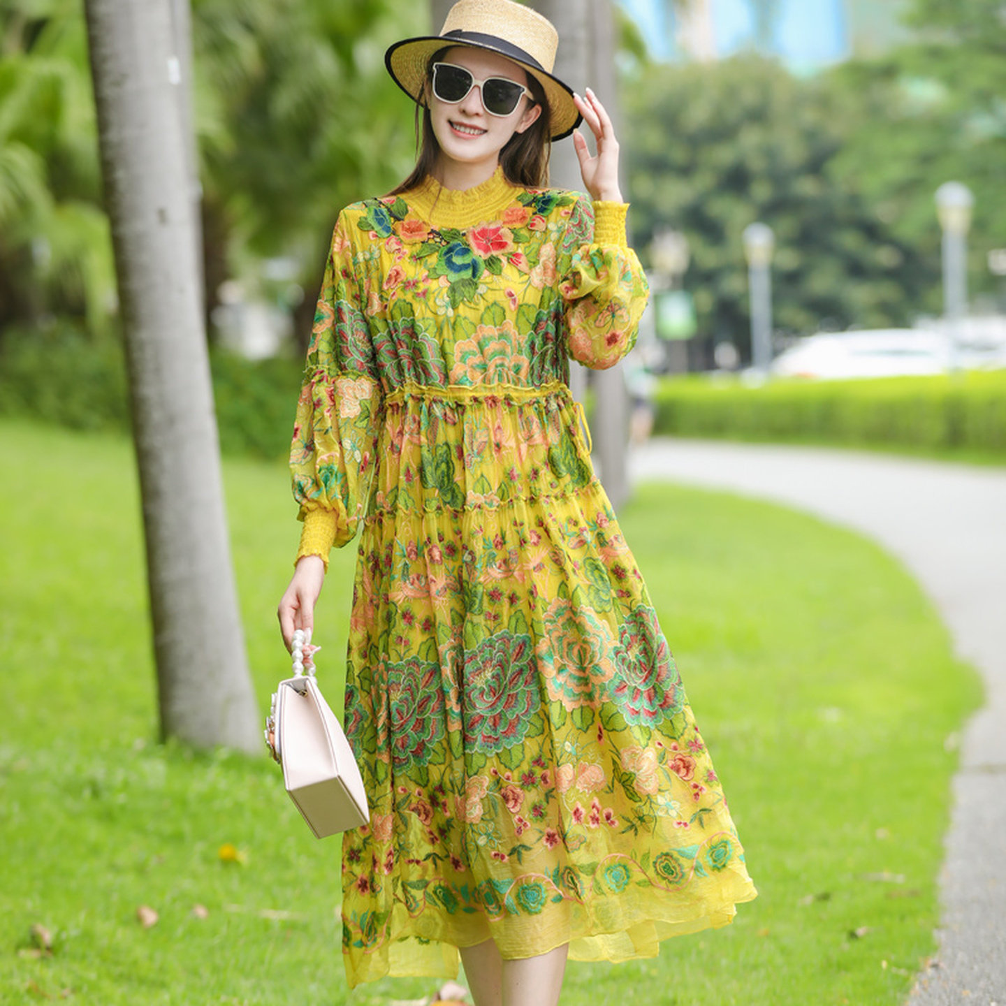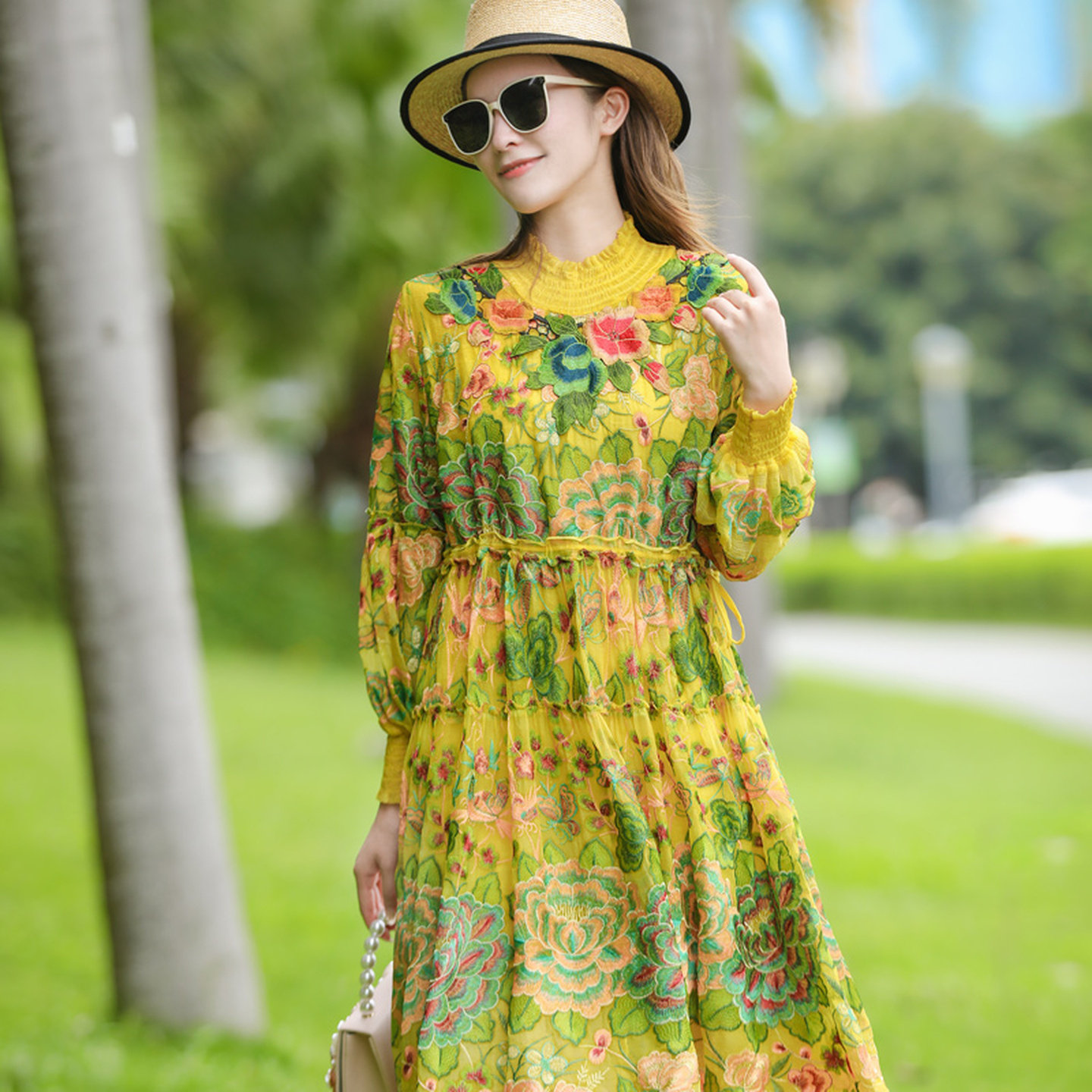 真丝连衣裙2025年新款高领长袖宽松收腰显瘦高档刺绣桑蚕丝a字裙