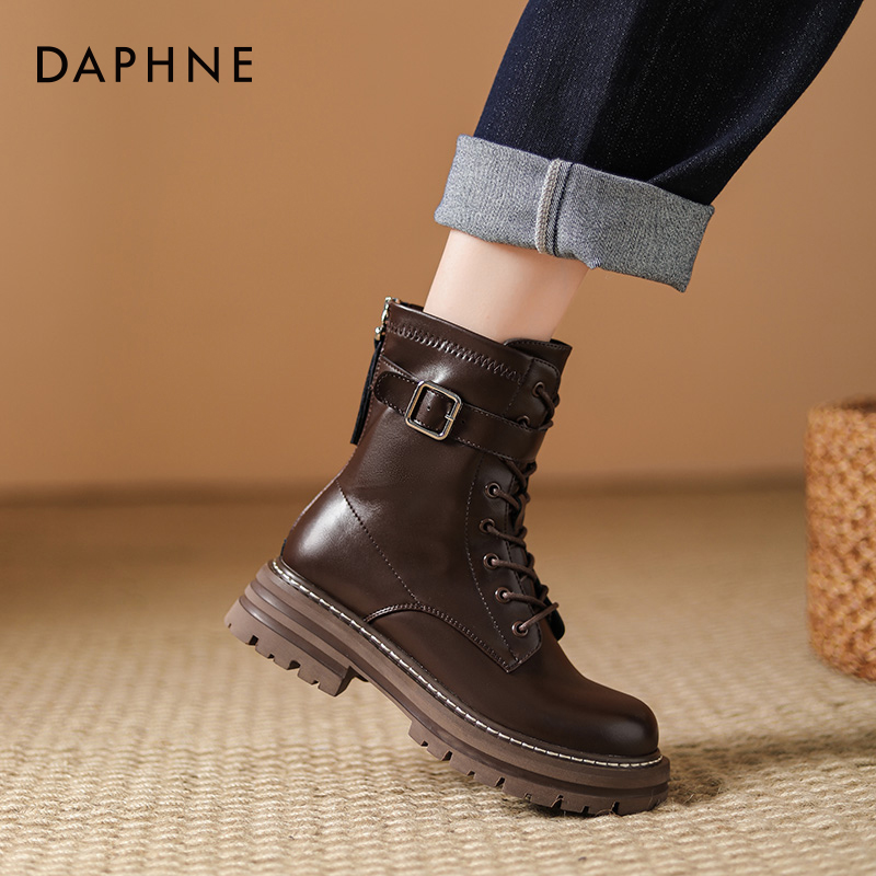 达芙妮厚底马丁靴女2024新款秋冬百搭机车中筒靴小个子棕色短靴女