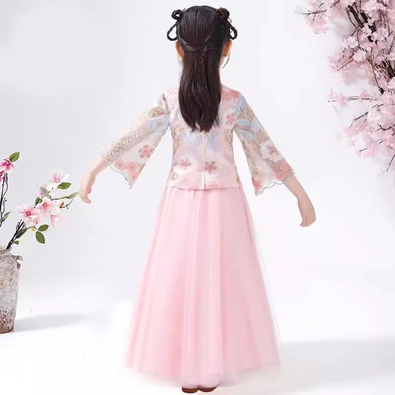汉服女童唐装仙女裙小学生连衣裙古装儿童礼服公主裙网袖旗袍套装
