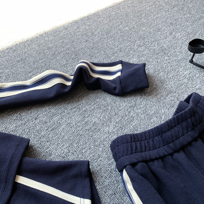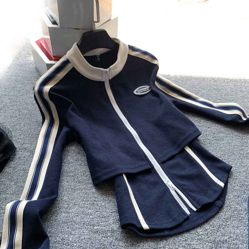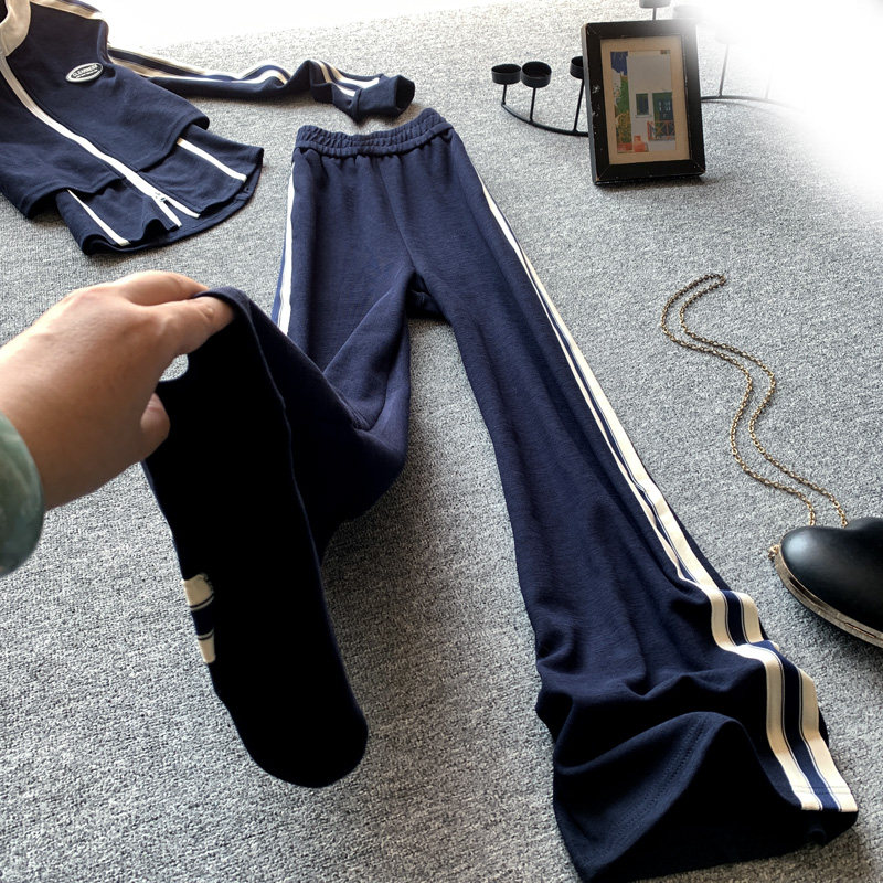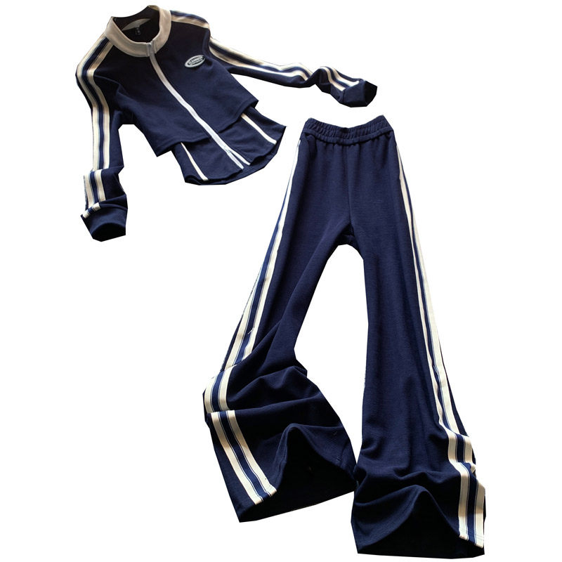 休闲时尚运动套装女春秋显瘦立领侧条纹假两件上衣阔腿裤两件套潮