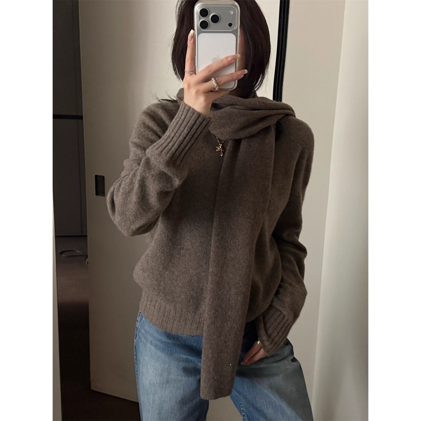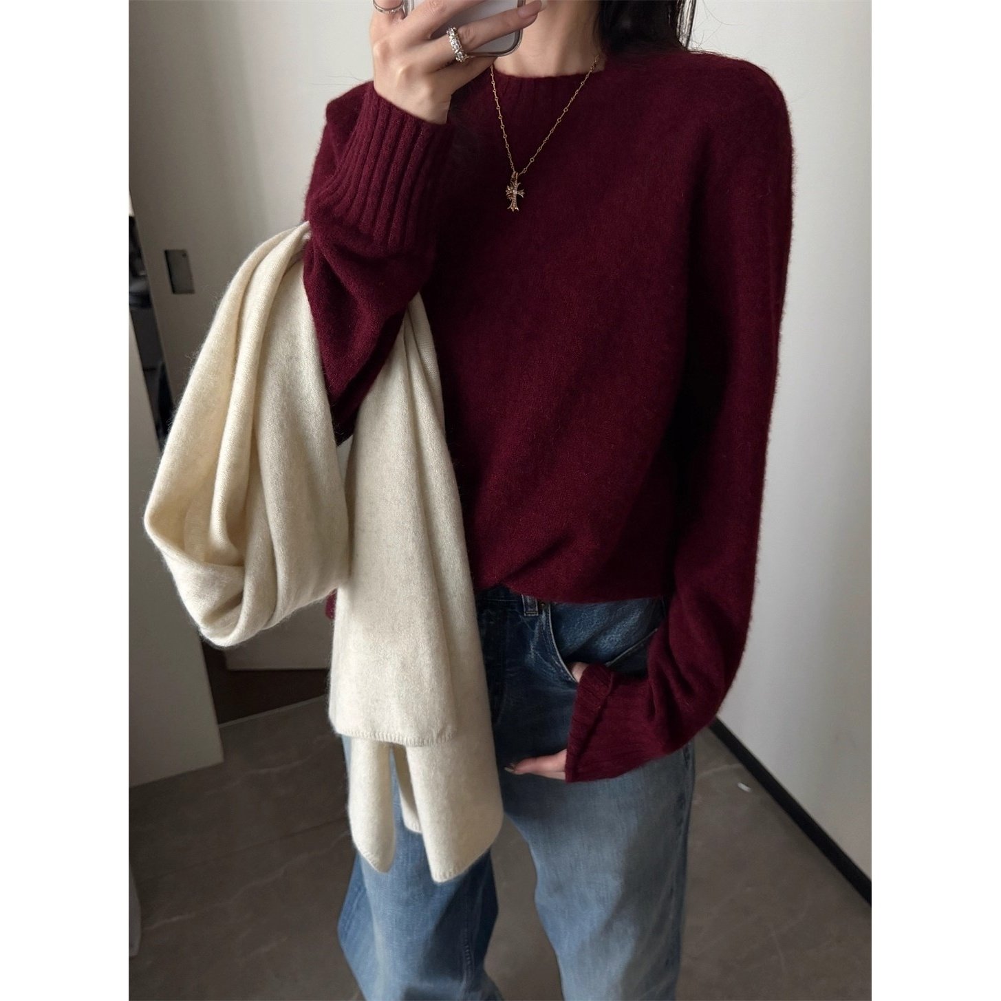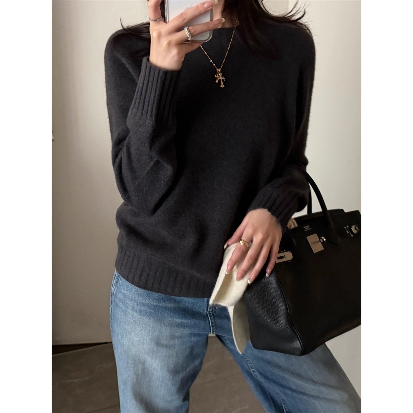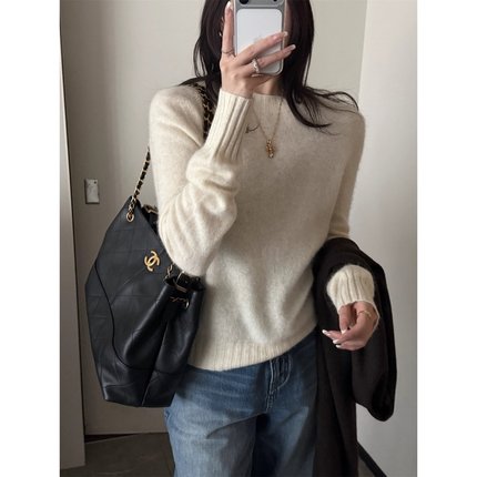 白色圆领套头针织衫毛衣女宽松简约慵懒风显瘦内搭打底衫上衣冬季