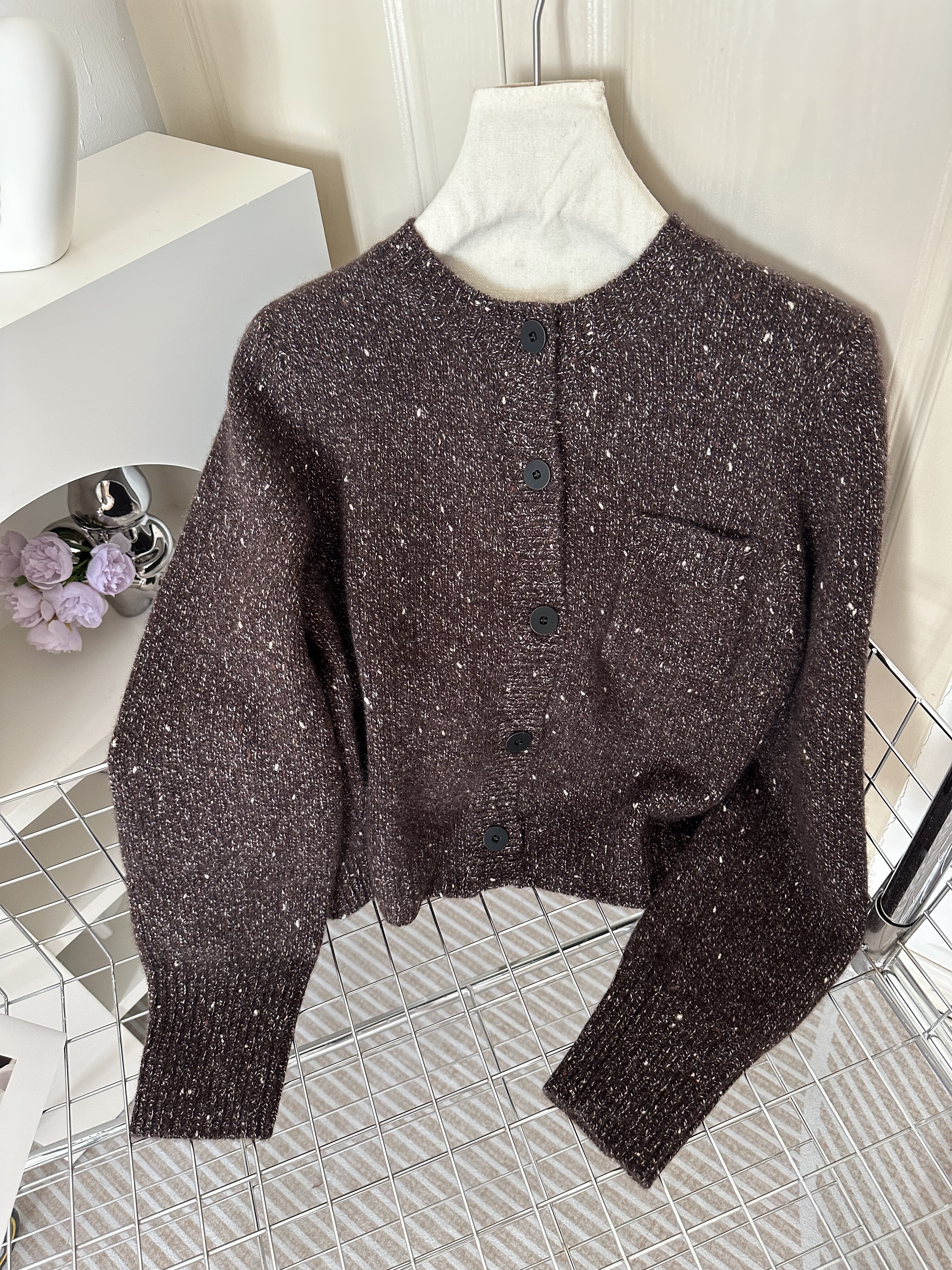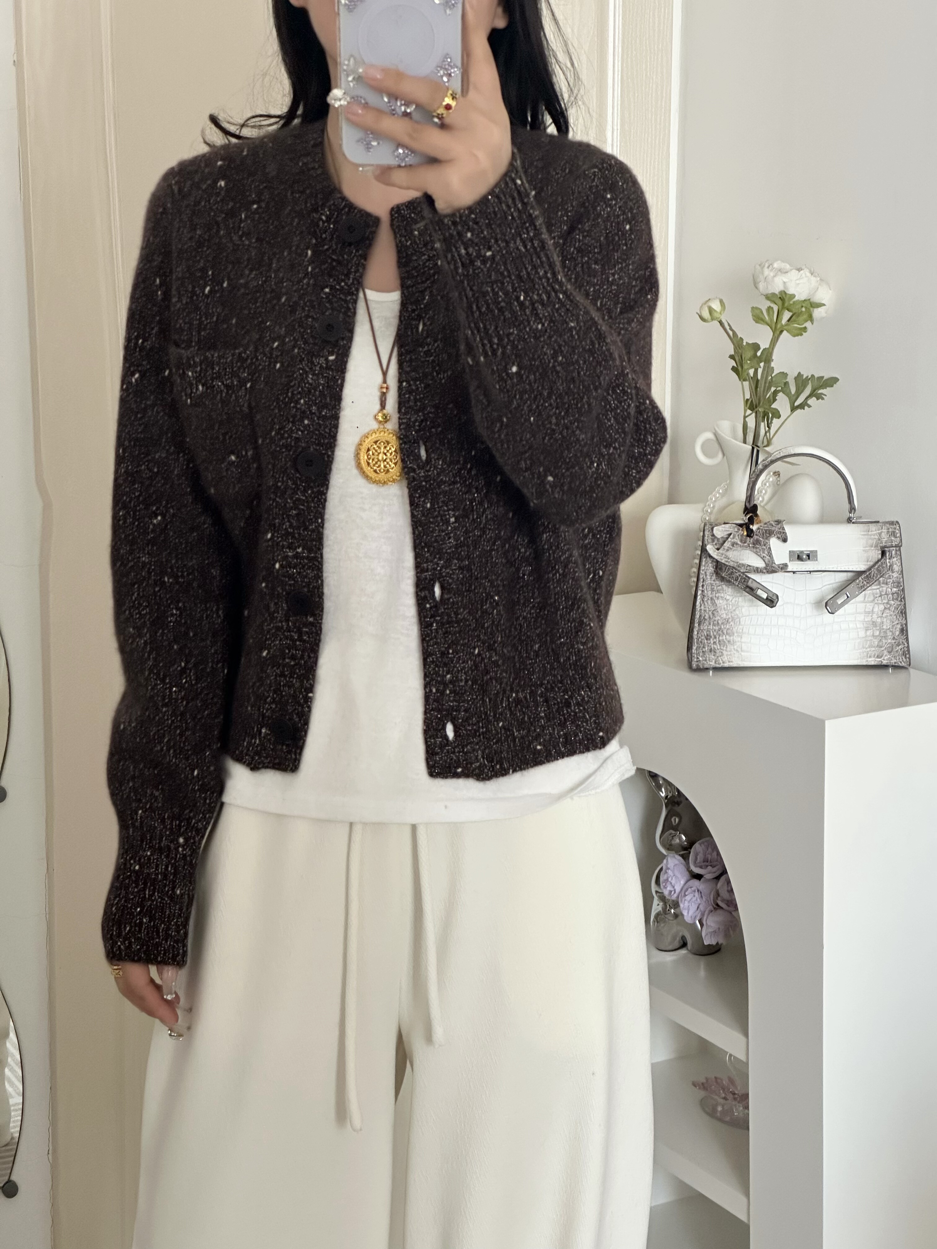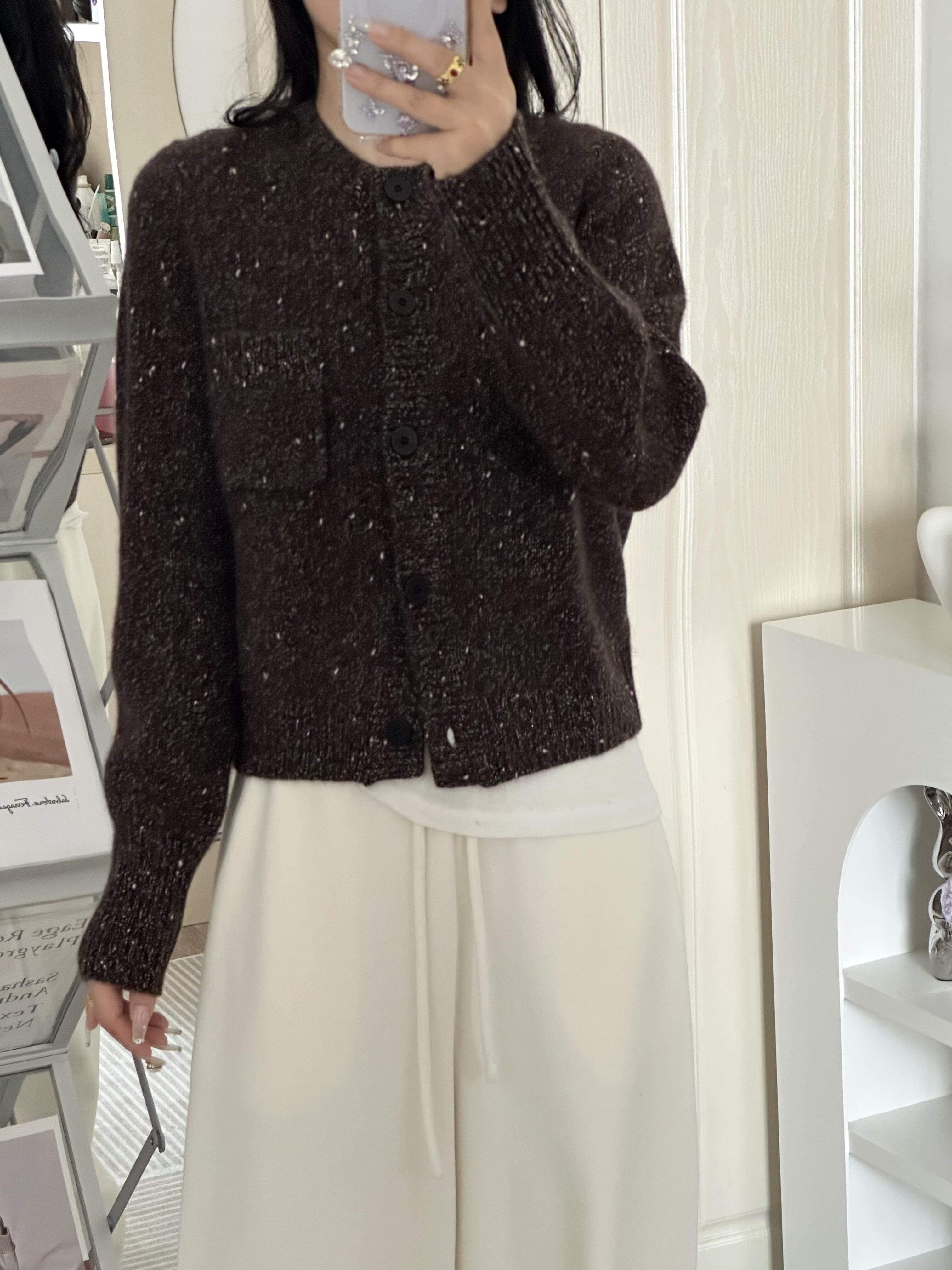 2025欧货新款高品质气质圆领花纱口袋山羊绒针织开衫毛衣