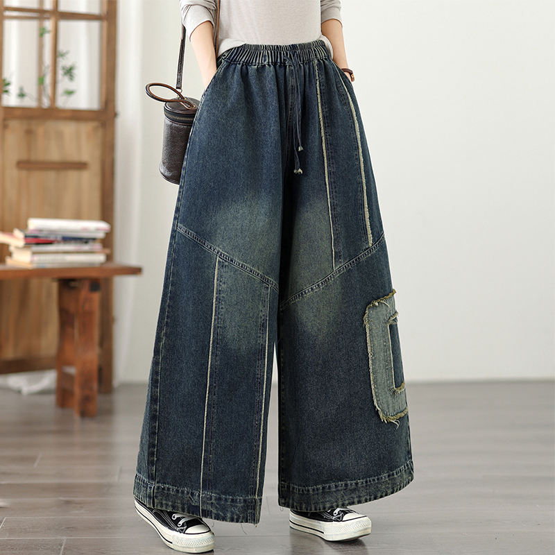 实拍大码牛仔阔腿裤新款重工松紧宽松显瘦休闲百搭牛仔直筒阔腿裤