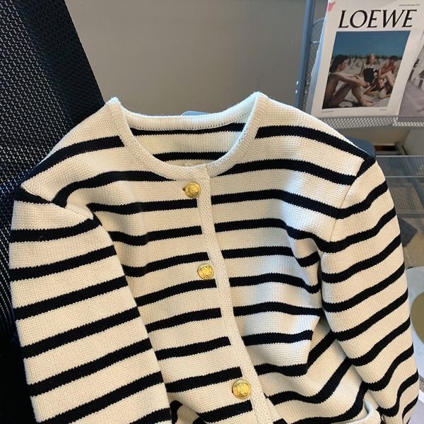 小香风针织开衫金扣休闲条纹圆领法式宽松短外搭毛衣外套女春秋