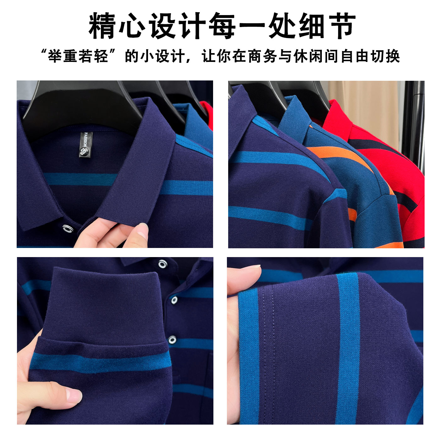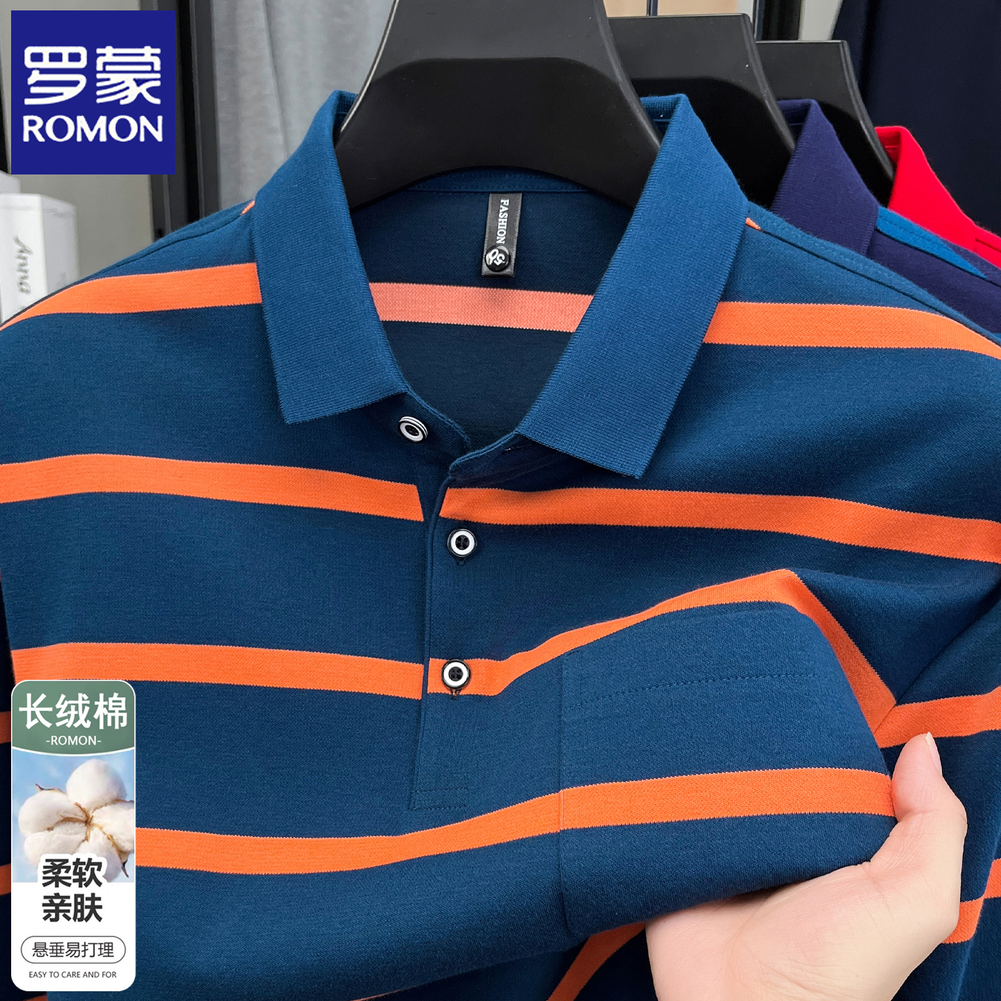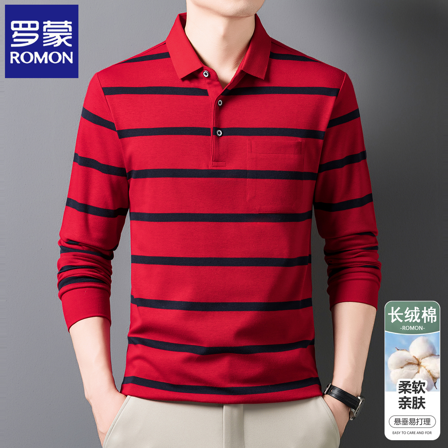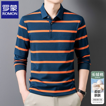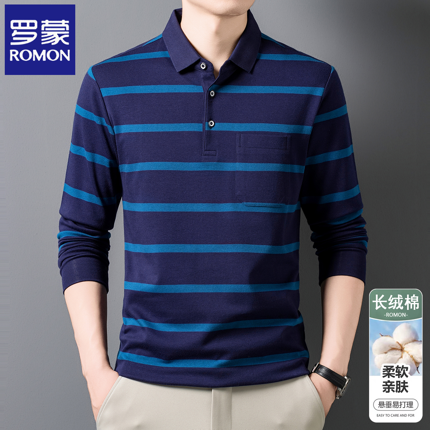罗蒙春秋季新款长袖t恤男士纯棉条纹上衣休闲Polo衫翻领口袋体恤