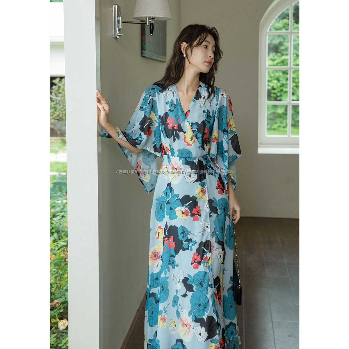 度假女神长裙!又簿又轻又复古2068蓝色V领雪纺连衣裙冰凉海滩裙