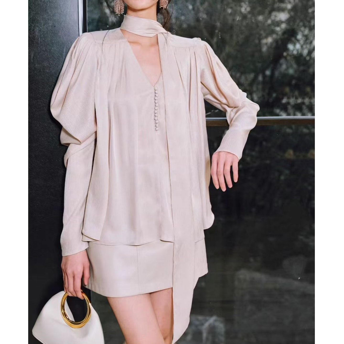 法式V领大码醋酸长袖衬衫女春秋2025气质飘带衬衣垂褶设计感上衣