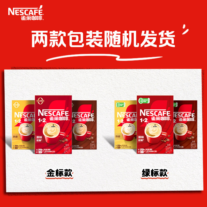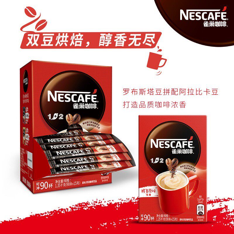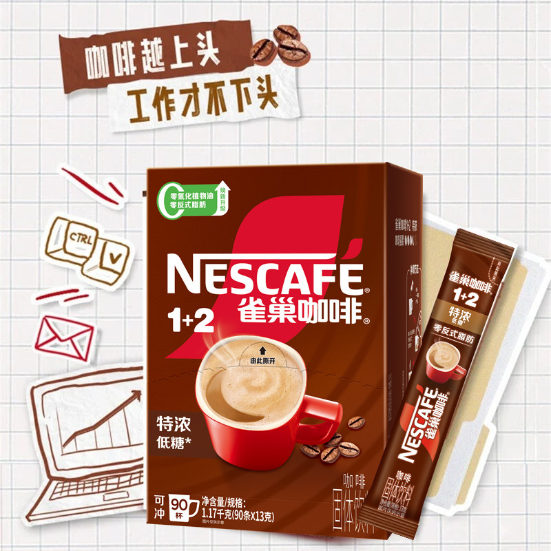 雀巢1+2原味咖啡三合一学生提神低糖速溶咖啡粉90条盒装官方正品