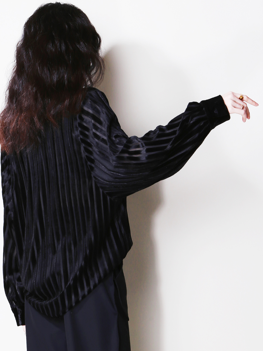 T95半镂空丝绒高级感复古欧美风竖条纹显瘦垂感宽松长袖圆领衬衫