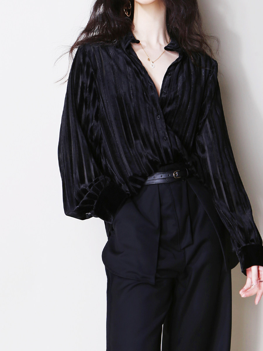 宽松欧美风长袖丝绒镂空条纹衬衫
