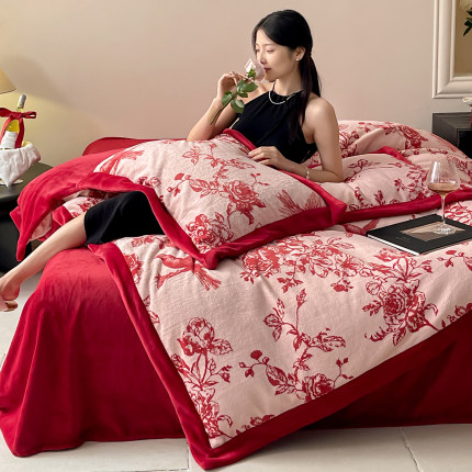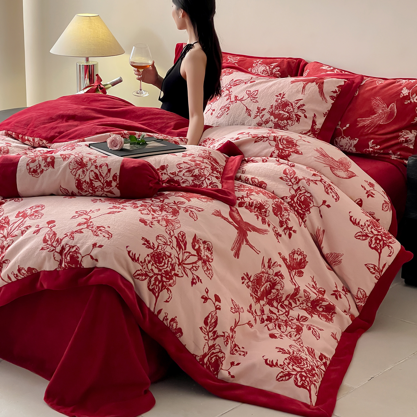 坤花花卉牛奶绒婚庆四件套红色秋冬季加厚珊瑚绒被套结婚陪嫁床品