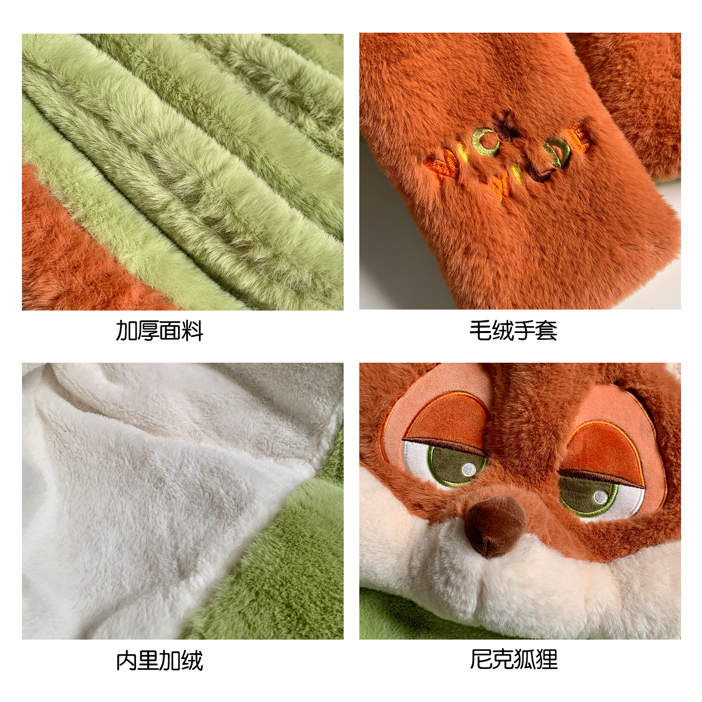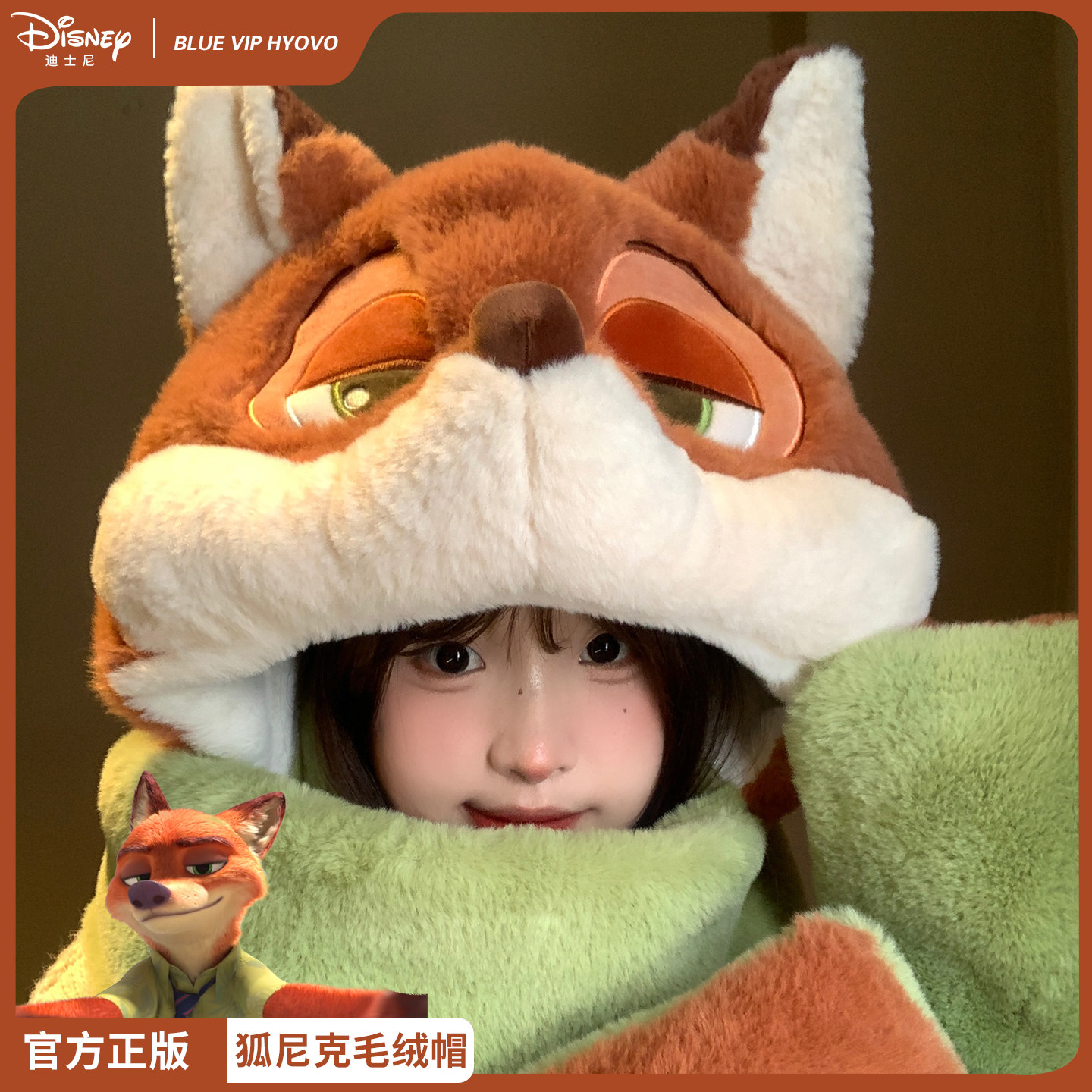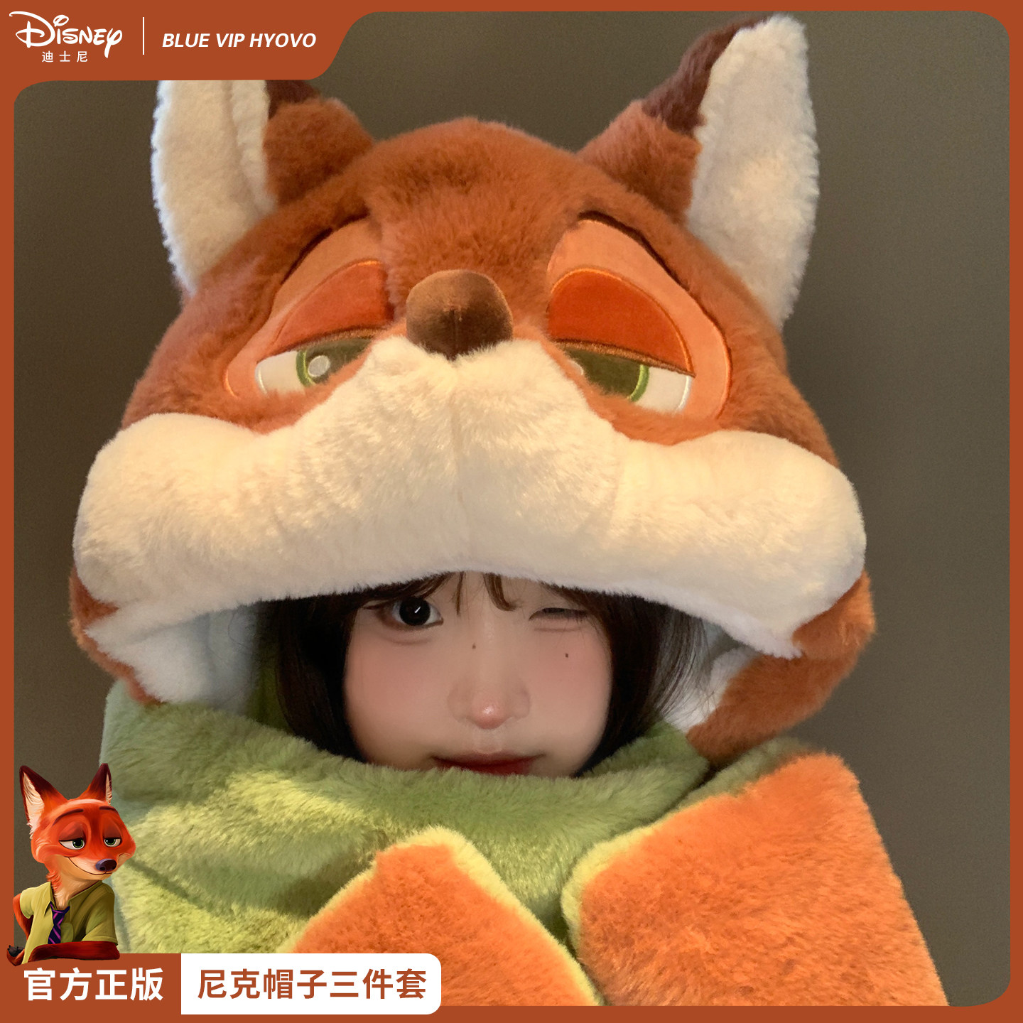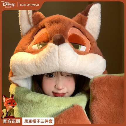 迪士尼狐狸尼克毛绒帽子围巾一体女冬加厚可爱保暖防寒手套三件套