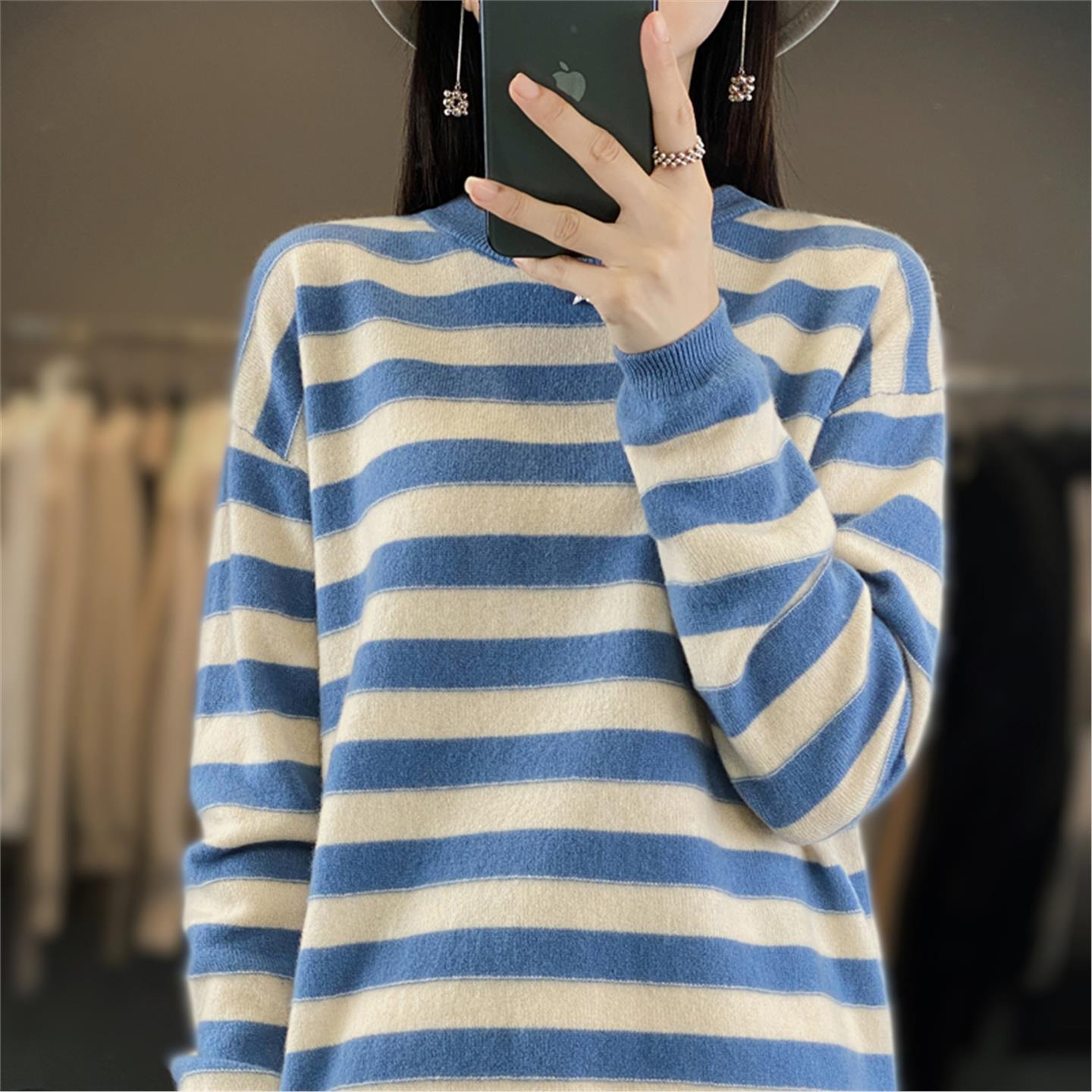 衫拼色低条纹春秋打底针织衫毛衣宽松内洋气女韩版百搭圆领新款搭