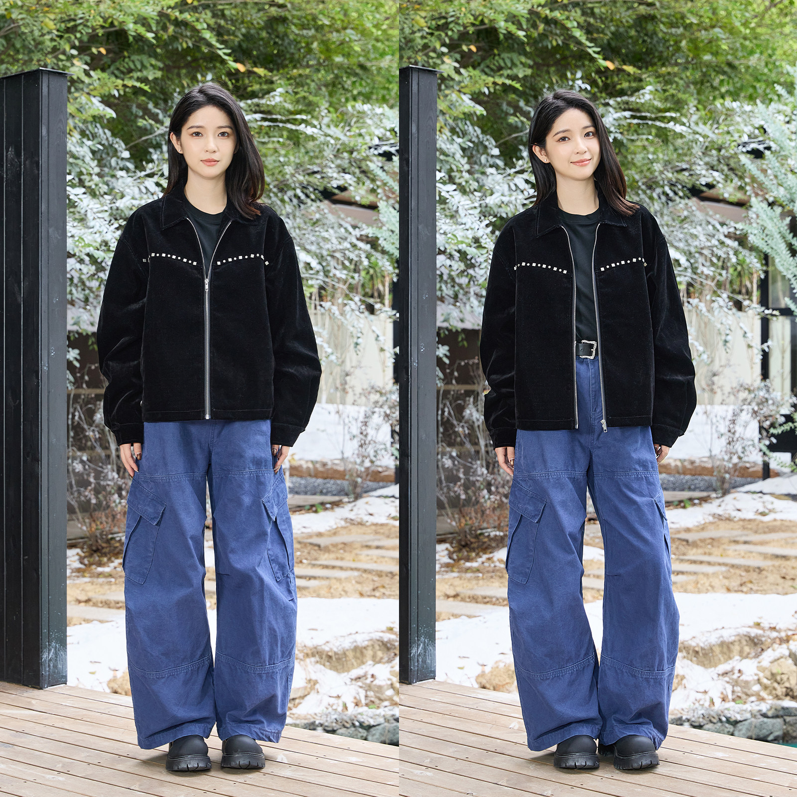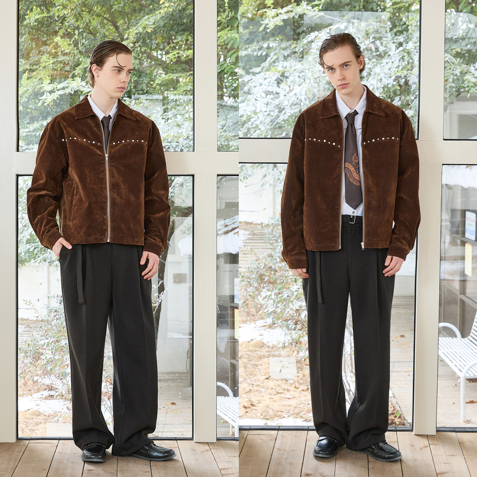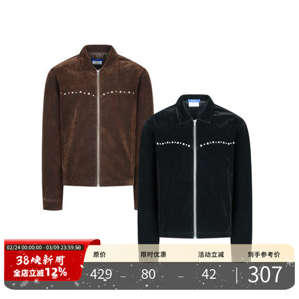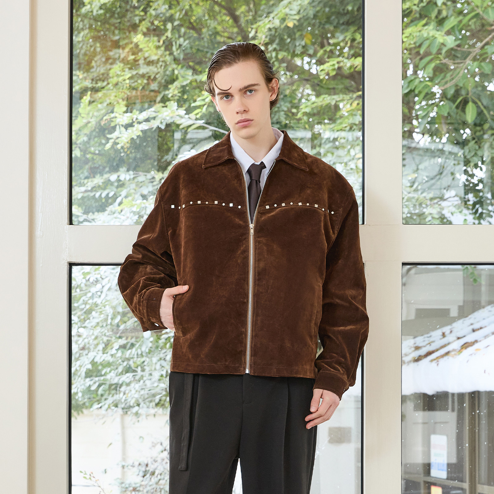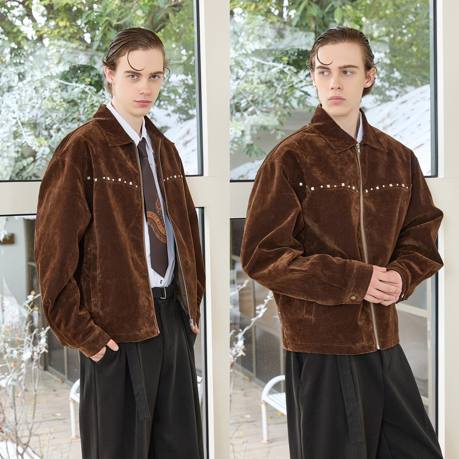 PMET「绅域」撞钉拼接植绒牛仔外套 复古宫廷老钱风翻领夹克上衣