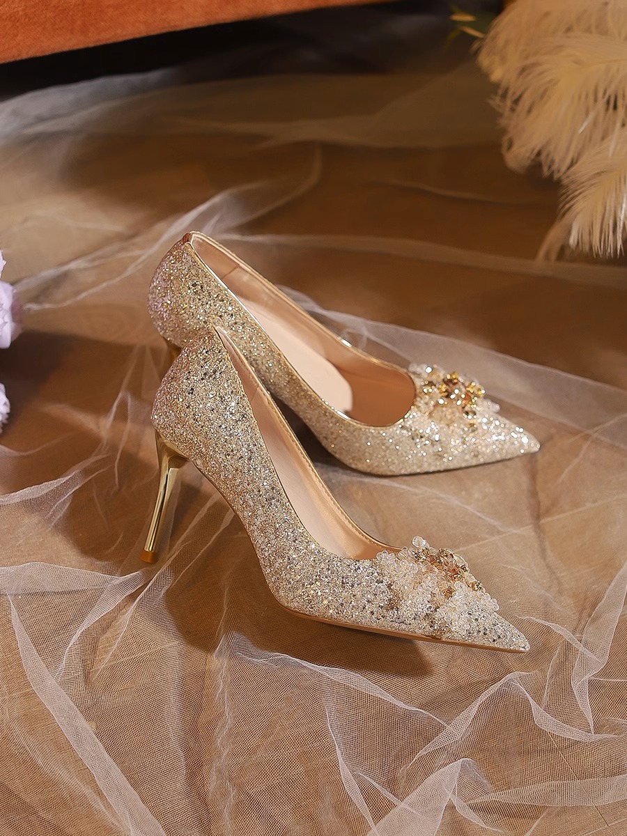 2025新款新娘秀禾主婚纱婚鞋珍珠花朵水晶法式日常配裙子高跟鞋女