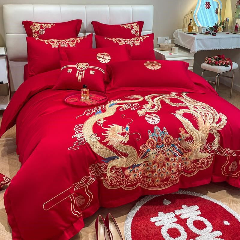 中式龙凤刺绣结婚四件套大红色床单被套喜被婚庆床上用品