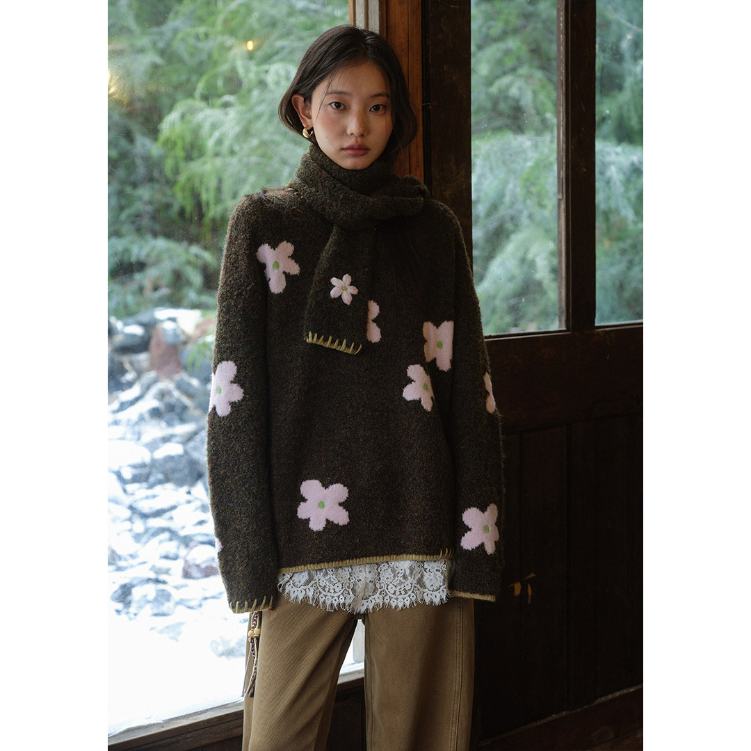 圈圈纱围巾式花朵套头毛衣