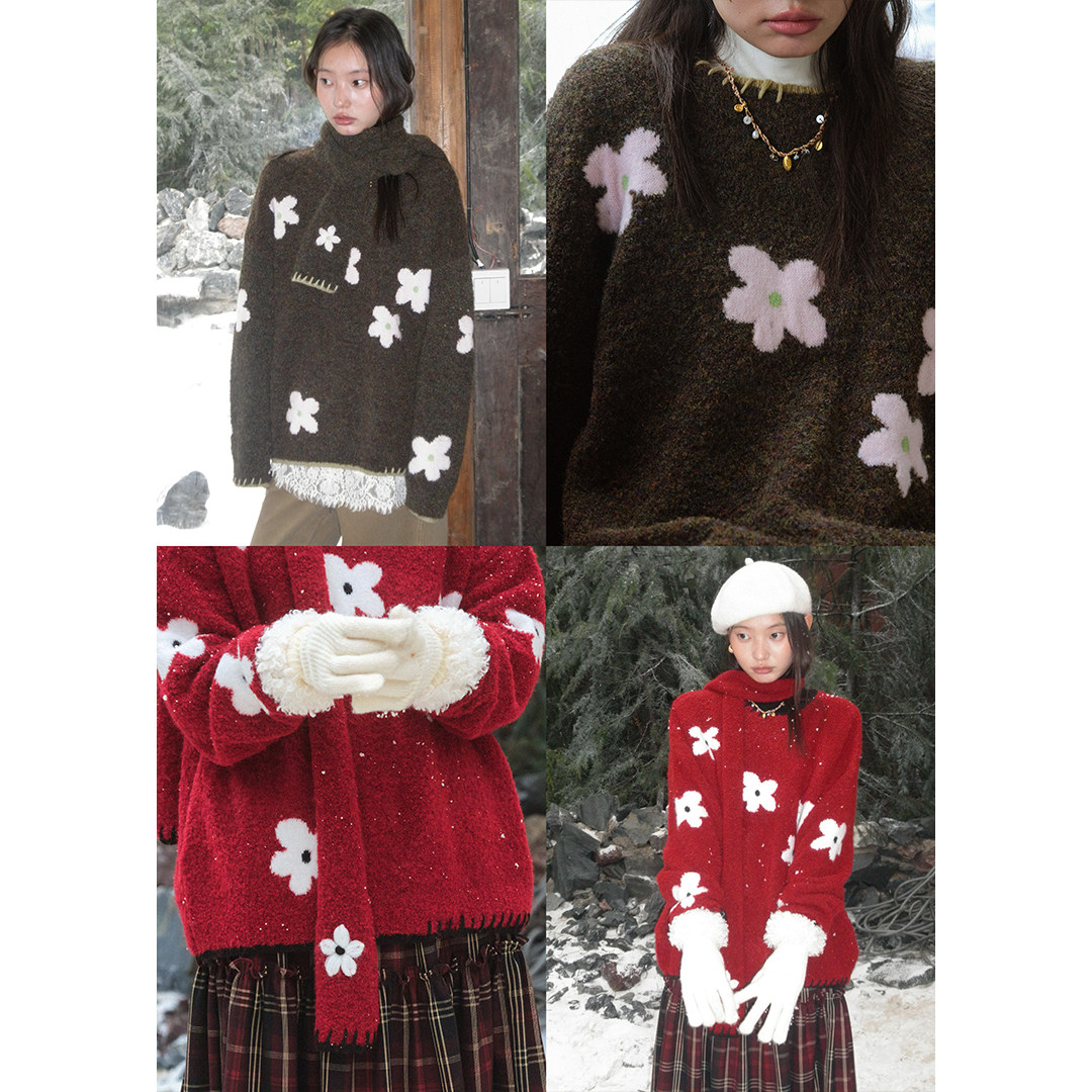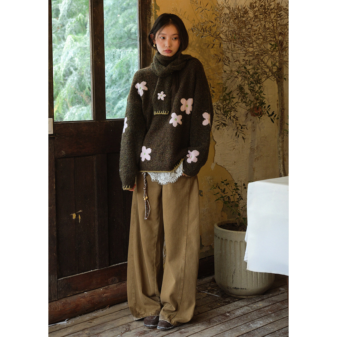 BLUEerror 圈圈纱围巾式花朵圆领套头毛衣女慵懒羊毛保暖针织衫冬
