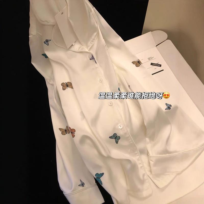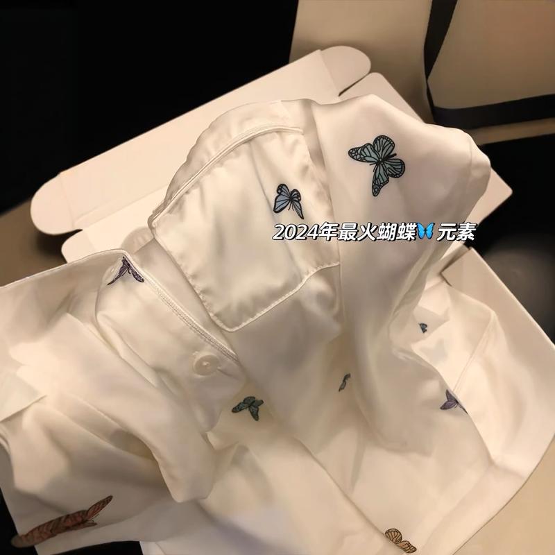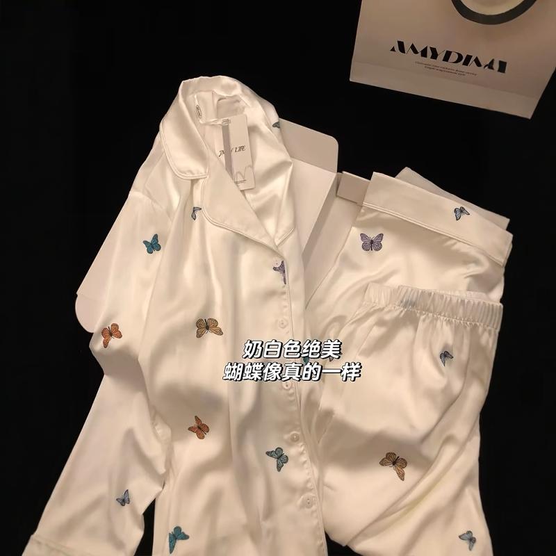 白月光蝴蝶睡衣女款春秋季2024新款冰丝长袖高级感丝绸家居服夏天