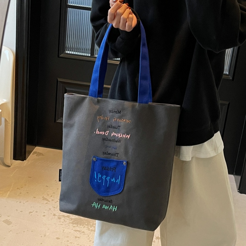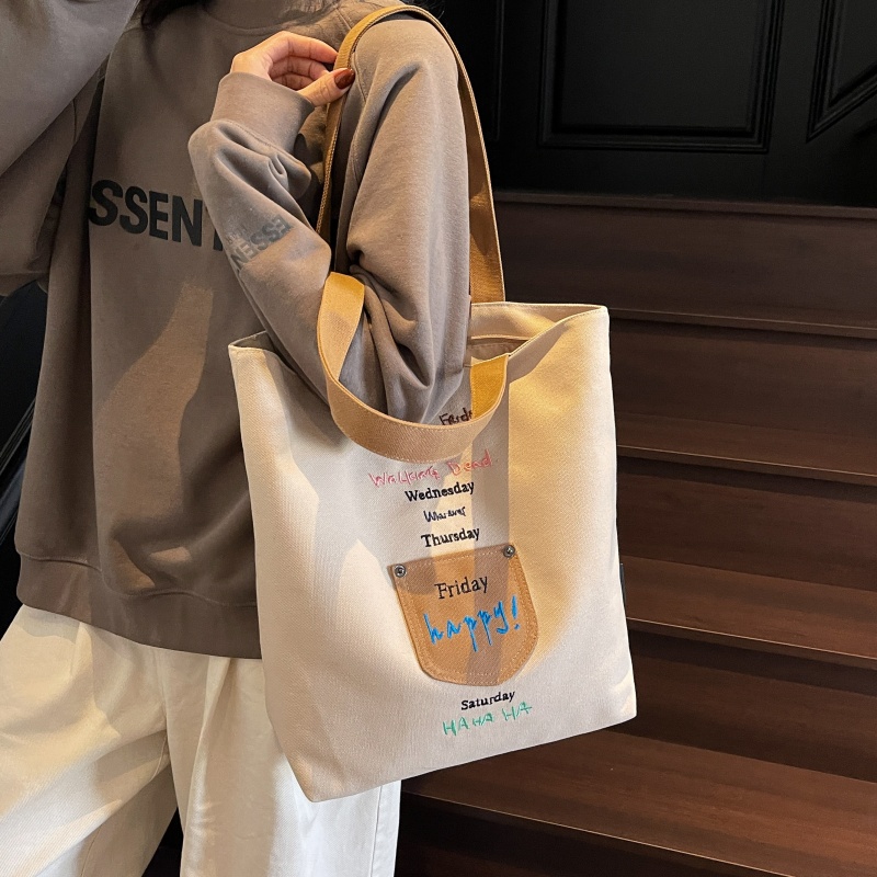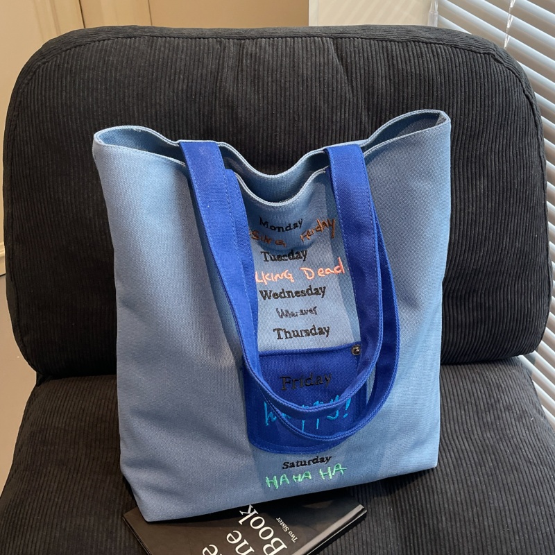 刺绣字母帆布包女大容量学生上课手提书袋小众百搭通勤单肩托特包