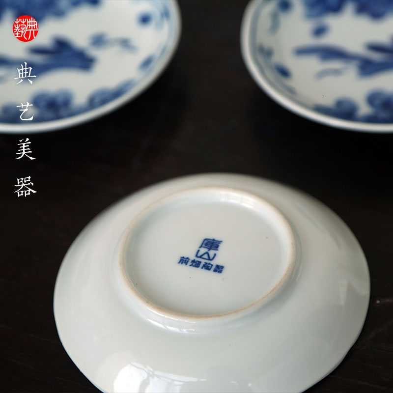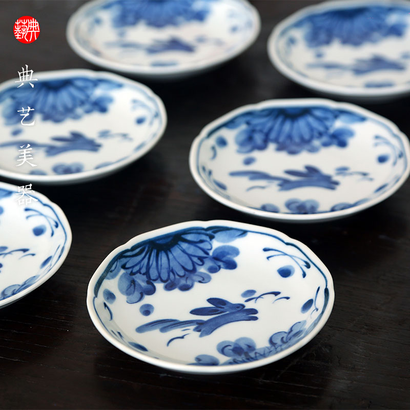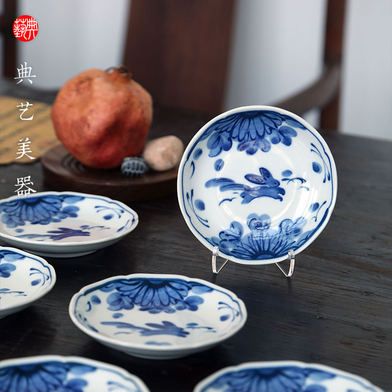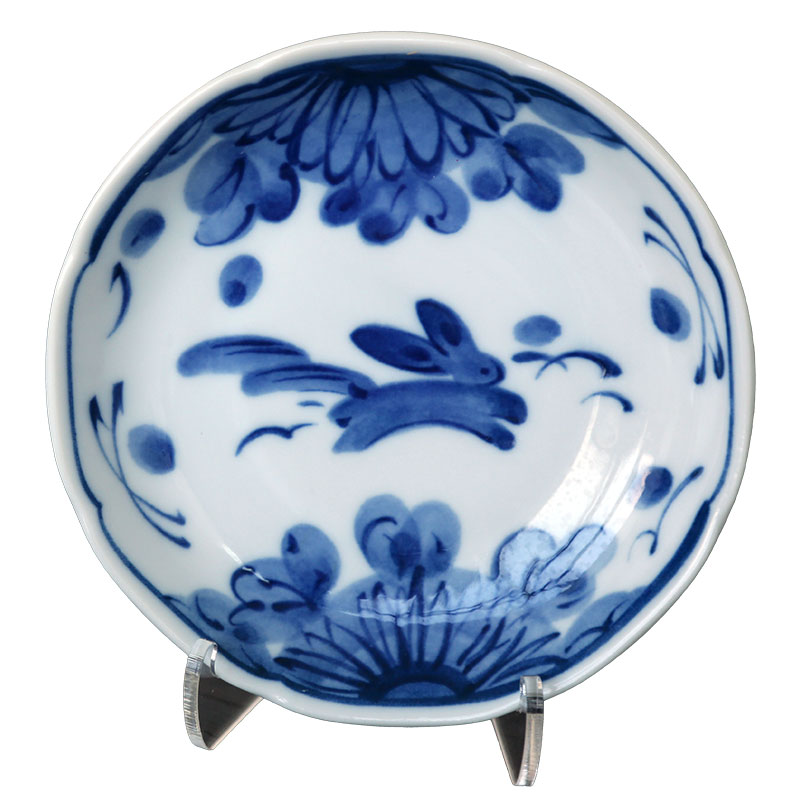 日本有田老库山前畑陶器染付兔中古时代物茶盘茶台茶具茶托圆形