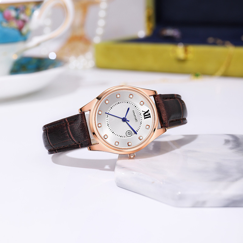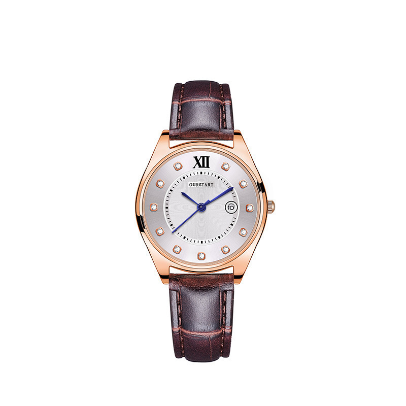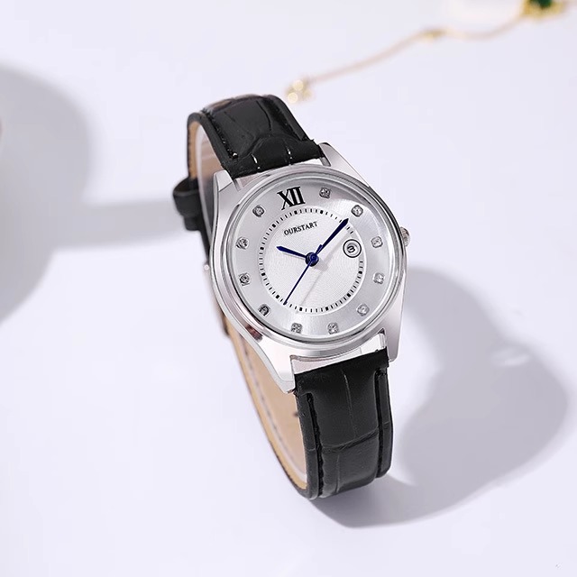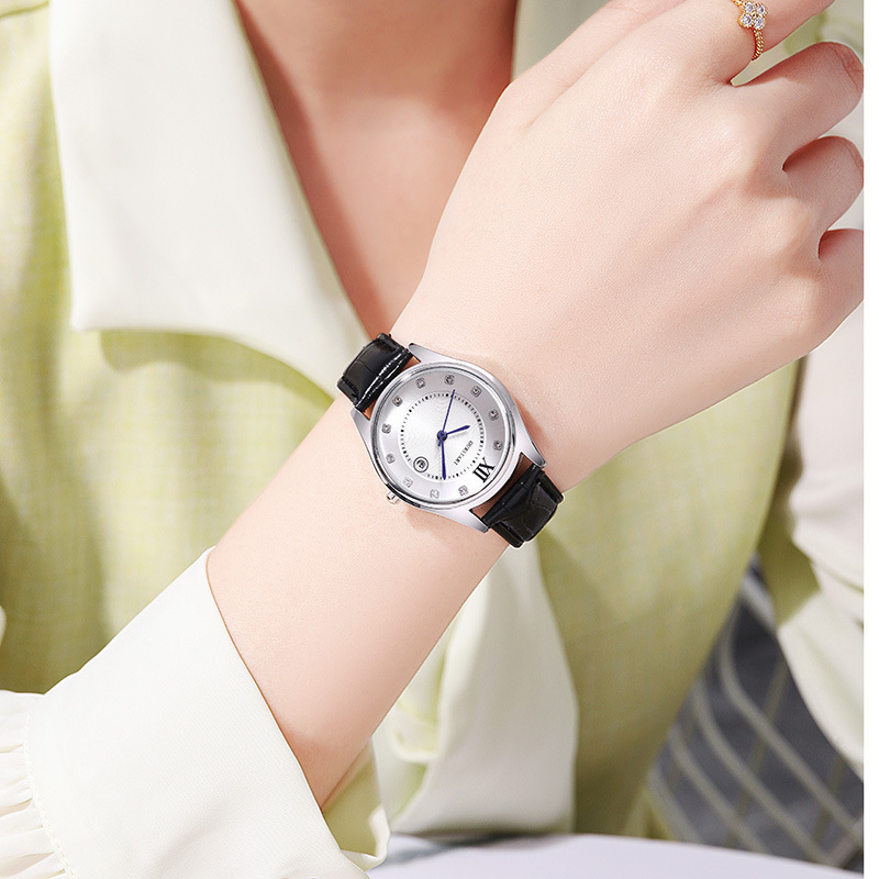 简约时尚蓝针女士手表 复古太阳纹百搭日历水钻皮带石英学生女表