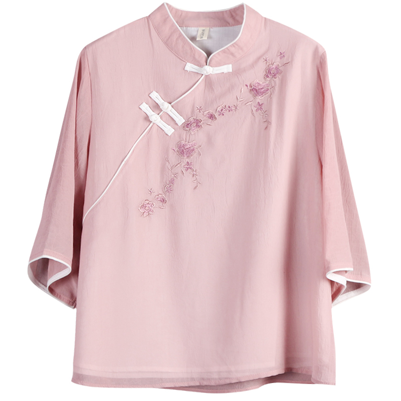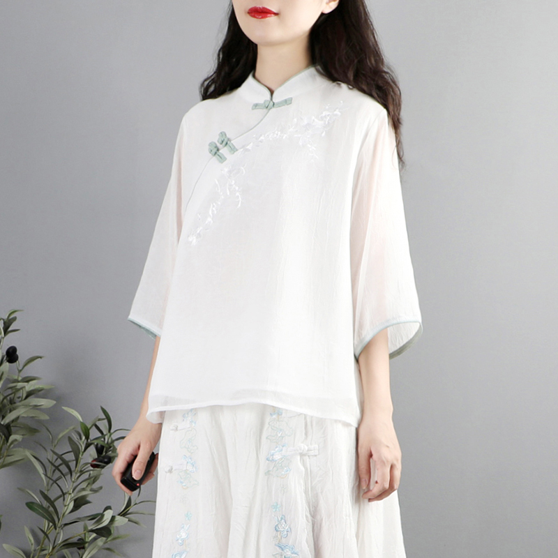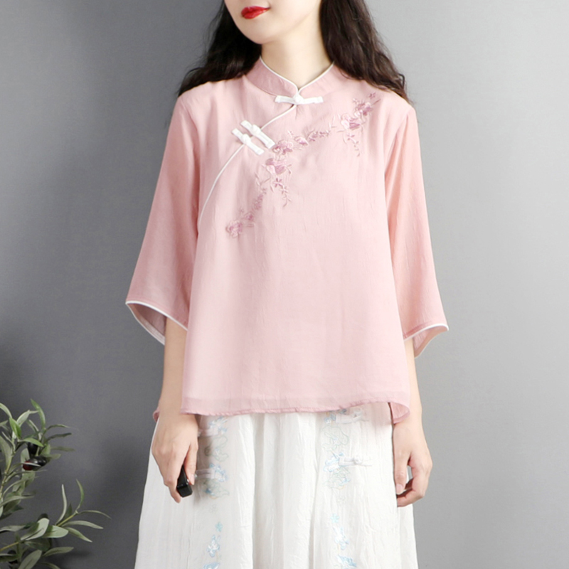 中式复古刺绣盘扣七分袖雪纺衬衫
