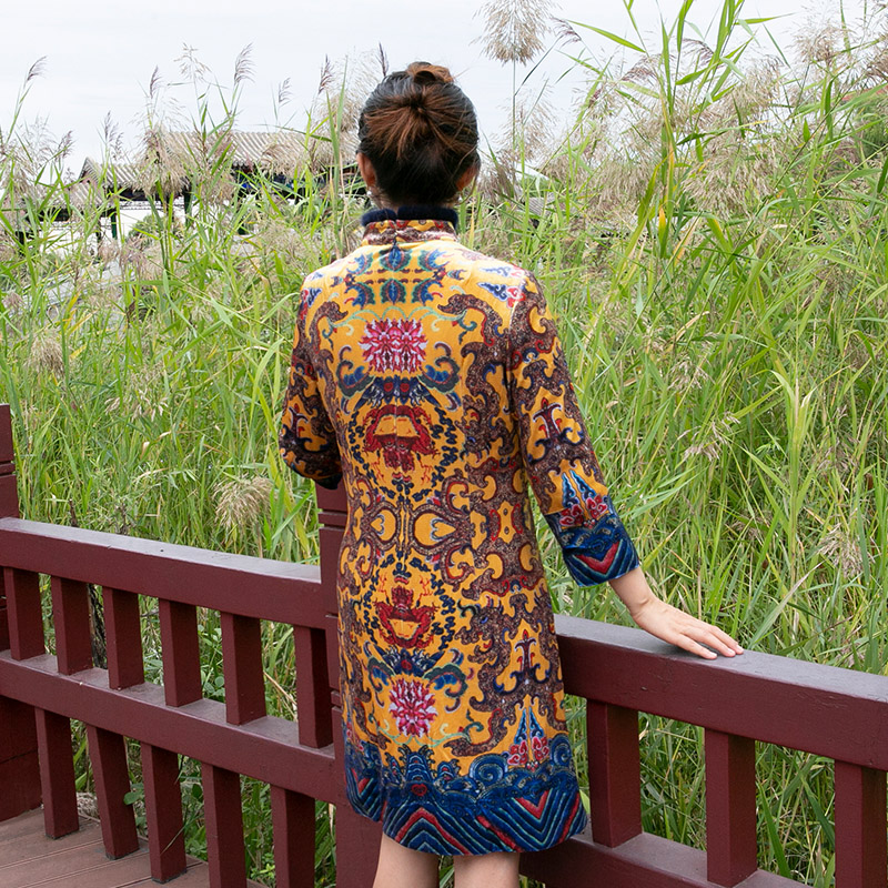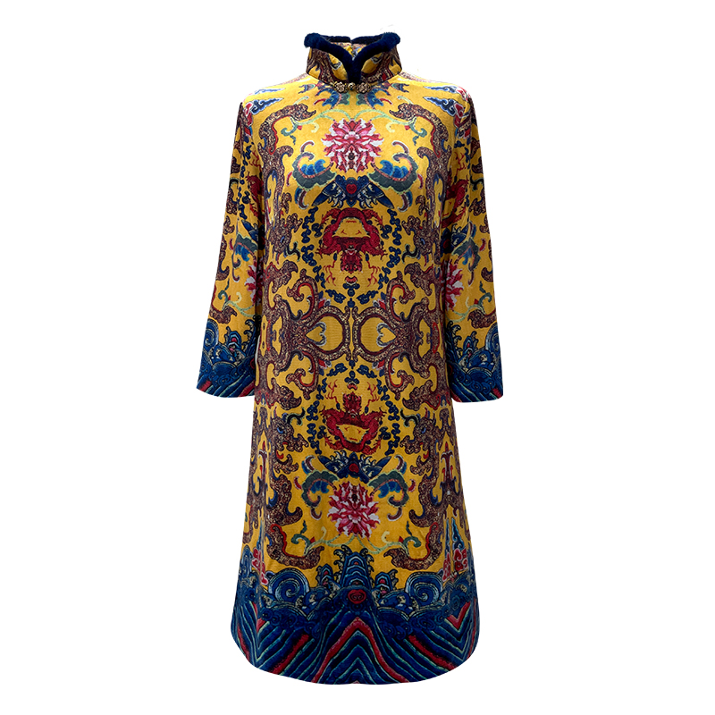 木真了龙纹丝绒连衣裙新品中式貂毛领日常加厚夹棉旗袍裙603