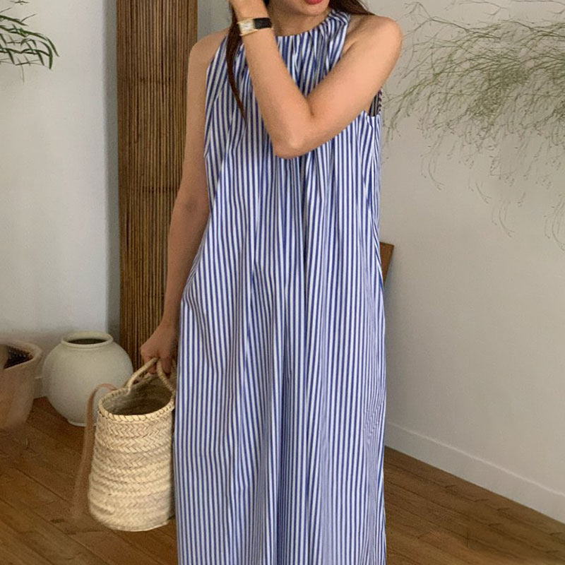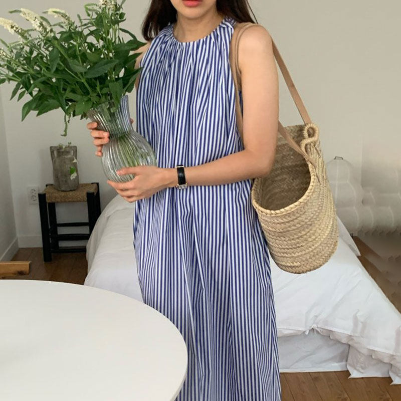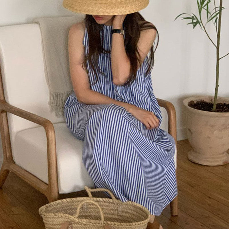 韩国chic夏季气质慵懒风圆领撞色条纹设计宽松休闲无袖背心连衣裙