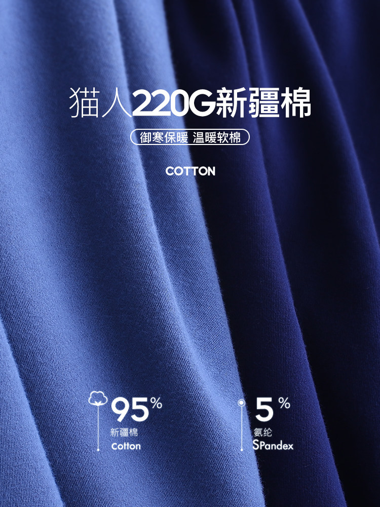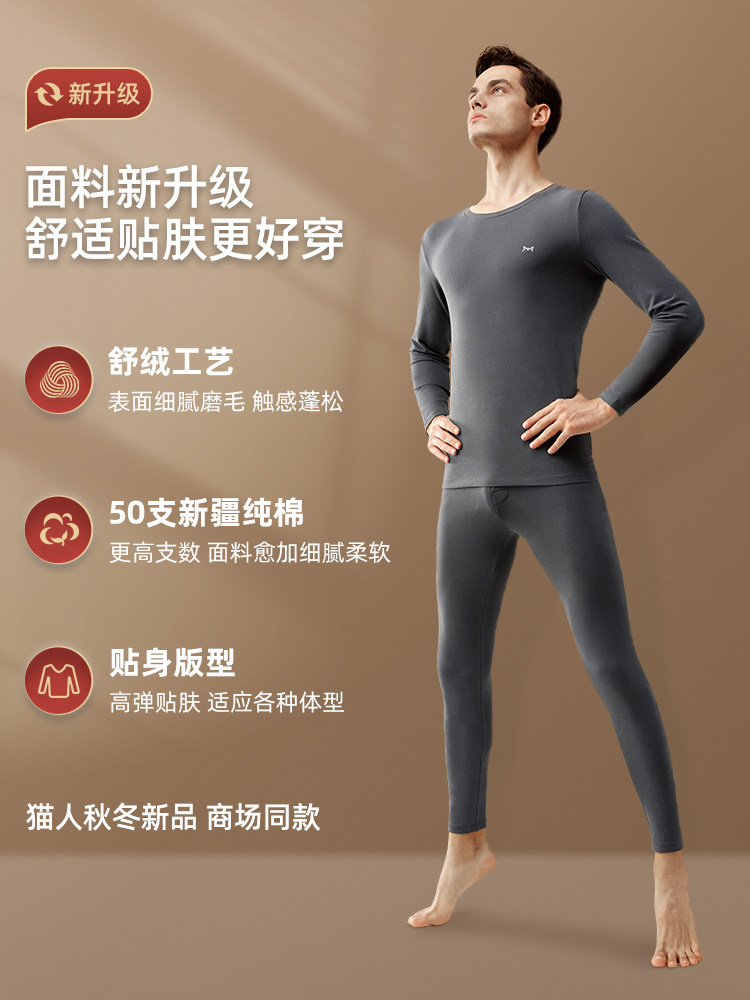 猫人男士秋衣秋裤纯棉秋衣裤套装秋冬青年圆领薄款打底保暖内衣男